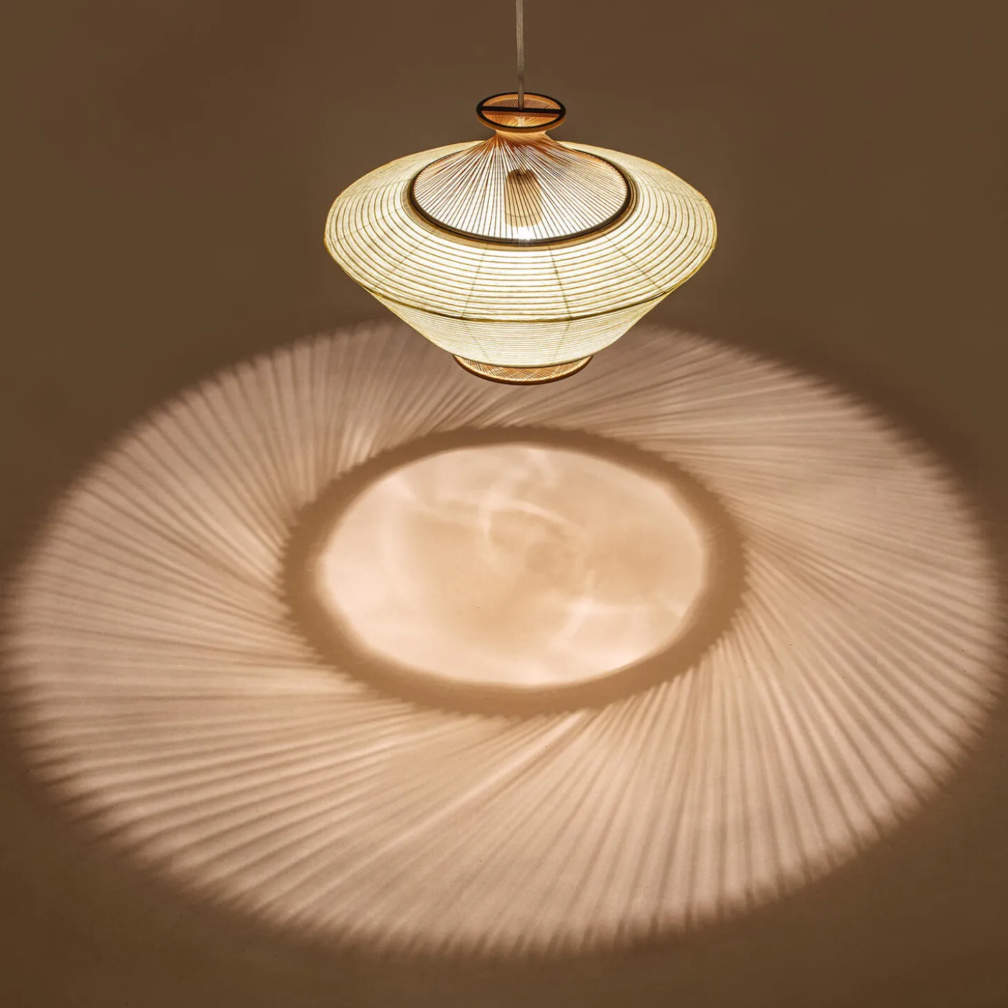 RON pendel håndlavet af bambusmestre i Japan. Aftagelig skærm som kan vendes for forskelligt udtryk fra MOTARASU. Pendlen skaber en varm stemning med det naturlige japanske højkvalitets washipapir og bambus. Normalt er papirskærme lavet med pinde der skygger for lyset men for RON er der i stedet støbt pinde i resin der leder lyset igennem.