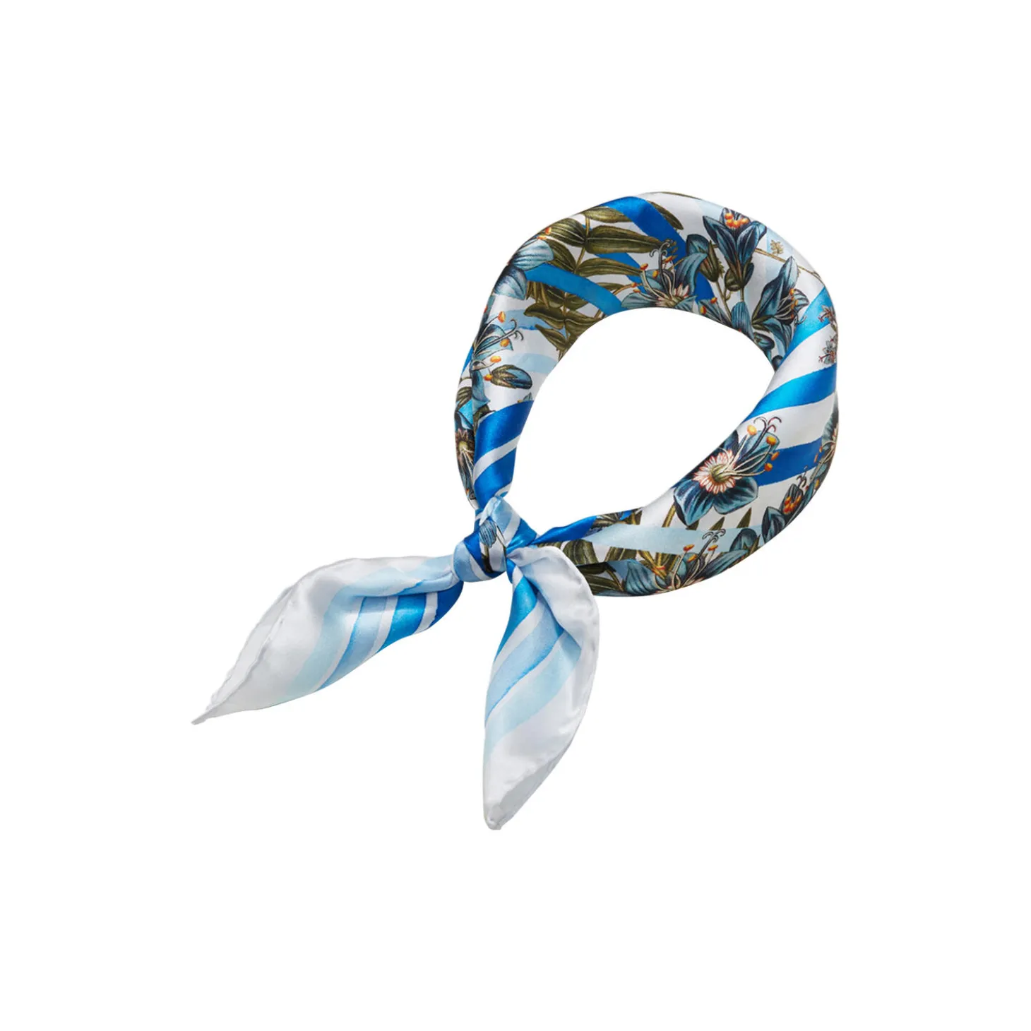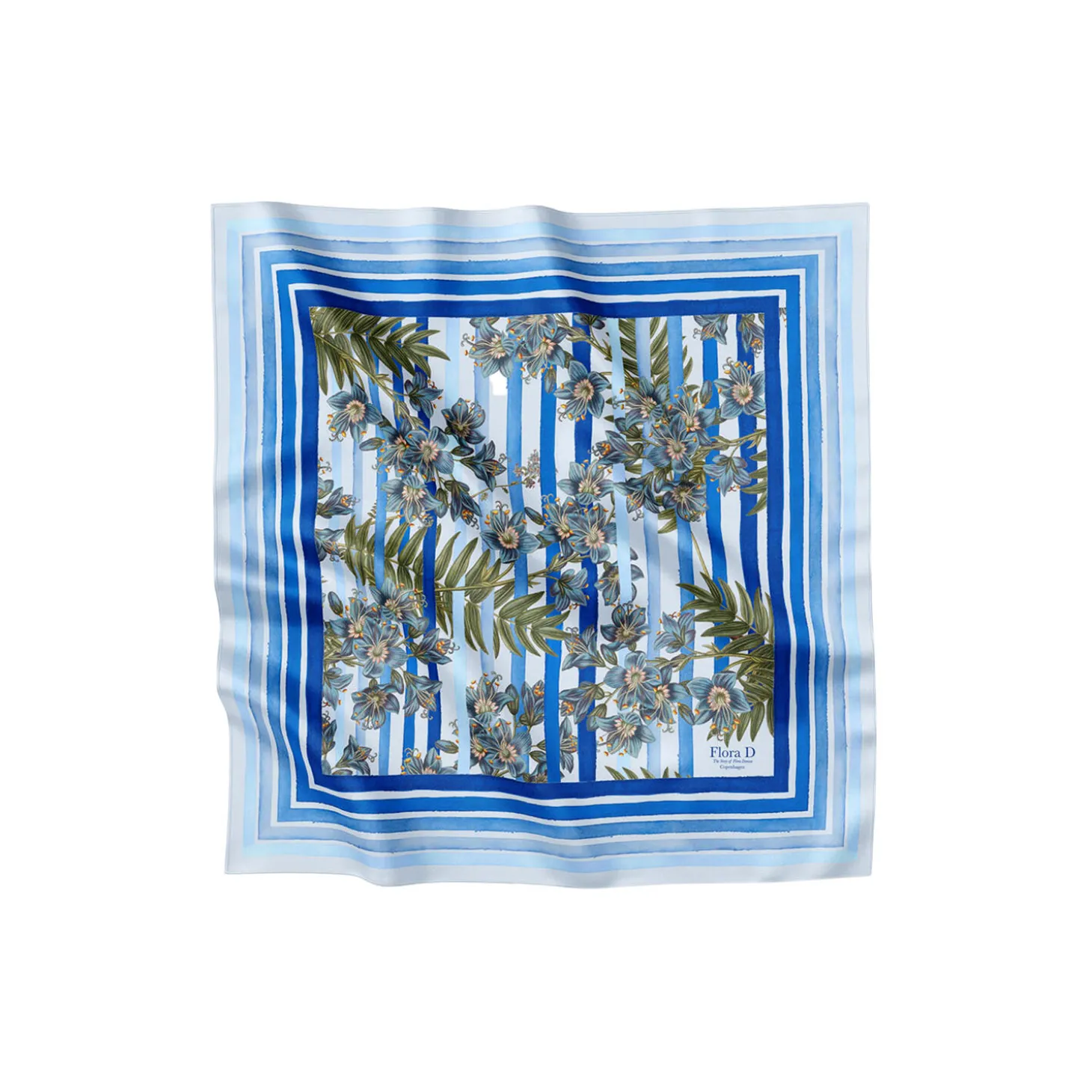 Et elegant tørklæde lavet i de skønneste nuancer af både lyseblå og mørkeblå. Tørklædet er pyntet med Flora Danicas blomsterillustration af blomsten Jakobsstige, mens de blå striber, der omkranser blomstermotivet, er håndmalet for at give tørklædet et kunstnerisk udtryk. Kvaliteten på tørklædet er 100% silkesatin, som sikrer, at det både er blødt, åndbart og behageligt at have på, men også at det er en kvalitet, som kan holde i mange år. Med dets mål på 53×53 cm er tørklædet både velegnet om halsen eller som dekorativt hårbånd. Dets kvadratiske form gør dog også, at kun fantasien sætter grænser for, hvordan tørklædet kan styles.
