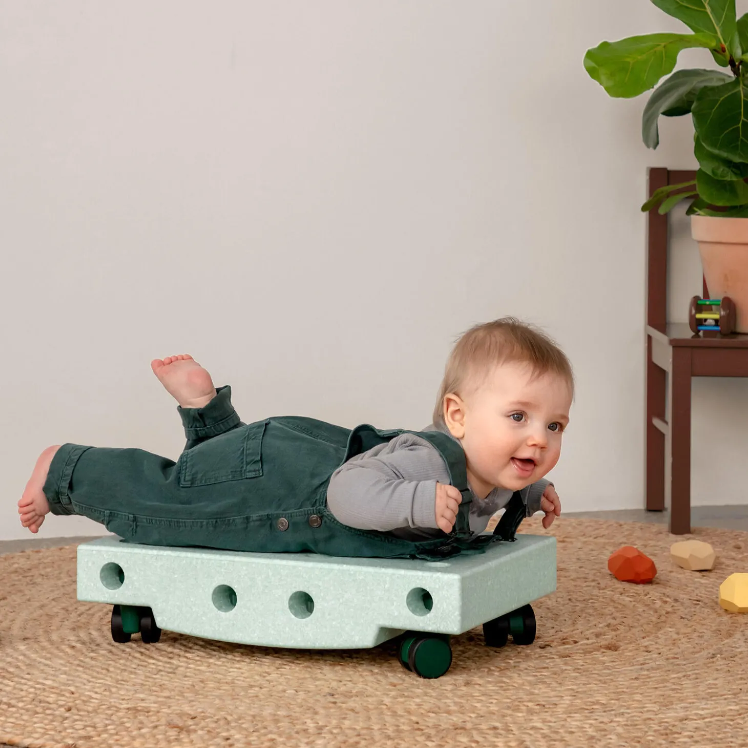 Perfekt til mavetid. Træner styrke og balance. Brug også som balancebræt.Styrk dit barns motorik med rullende leg. MODU Rullebrættet er et enkelt og alsidigt aktivitetslegetøj til grundlæggende motorisk træning med babyer og tumlinger. Læg dit barn på maven og sus rundt på gulvet, eller fjern hjulene og vip frem og tilbage. Selv små bevægelser og sanseindtryk kan bringe smilet frem hos små børn — og det bliver kun sjovere! Som dit barn vokser, kan det suse og snurre sig selv rundt helt uden hjælp fra mor og far. Fjern hjulene og brug brættet til balancetræning, eller byg det om til en gyngehest eller lille gåbil ved at tilføje andre MODU-klodser.Antal dele: 5 stk (1x klods / base, 4x drejehjul)Alder: 0 – 6 år (og resten af familien)Vægtgrænse: Maks. 50 kgMål: 50 x 30 x 12 cmPleje: Tør af, tag med i bad, tåler opvaskemaskineMaterialer: 100% genanvendeligt EPP-skum og fødevaregodkendt ABSProduktion: Produceret i Lyon, Frankrig og Odense, Danmark