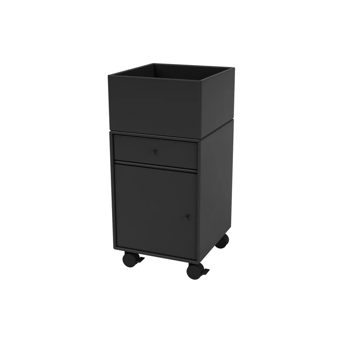 RUNNER er opbevaring på hjul, så du på hjemmekontoret eller i andre rum kan rulle det nødvendige udstyr hen, hvor du skal bruge det. Øverst er der kassen, åben i toppen, her kan du opbevare planter – alternativt, mapper, bøger, plakatrør eller lignende. Under topkassen er der en skuffe og et lille skab. RUNNER er dermed helt perfekt til ændre funktion og skabe forandring på det lille hjemmekontor.