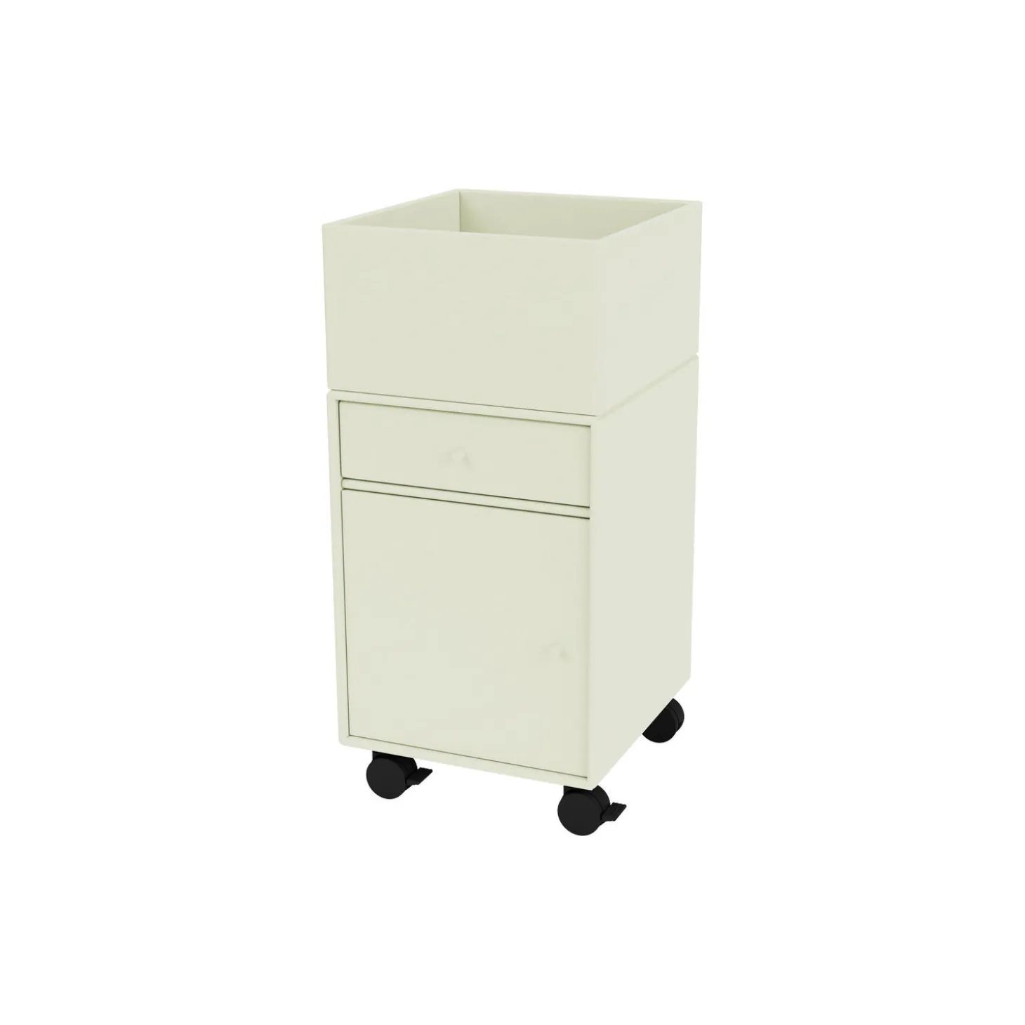 RUNNER er opbevaring på hjul, så du på hjemmekontoret eller i andre rum kan rulle det nødvendige udstyr hen, hvor du skal bruge det. Øverst er der kassen, åben i toppen, her kan du opbevare planter – alternativt, mapper, bøger, plakatrør eller lignende. Under topkassen er der en skuffe og et lille skab. RUNNER er dermed helt perfekt til ændre funktion og skabe forandring på det lille hjemmekontor.