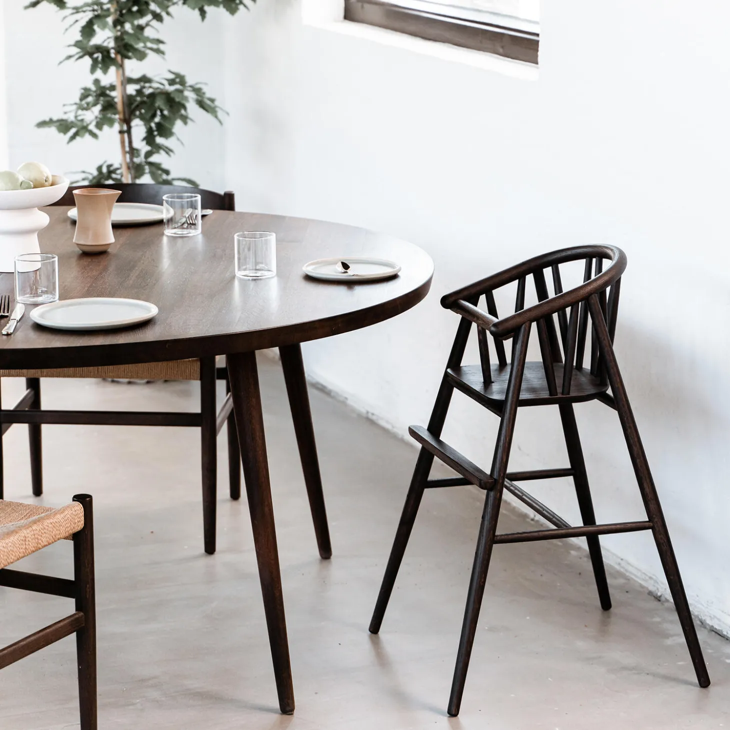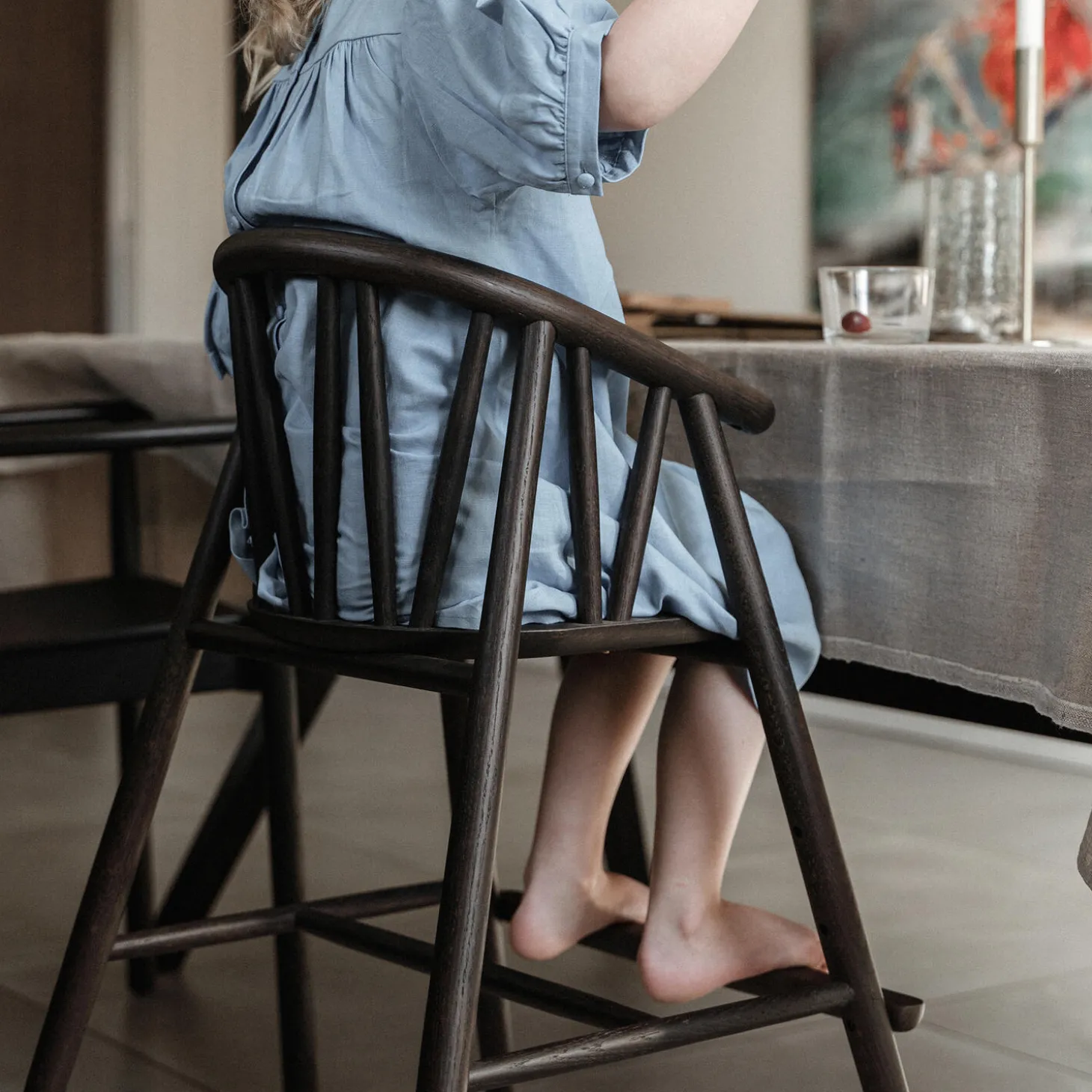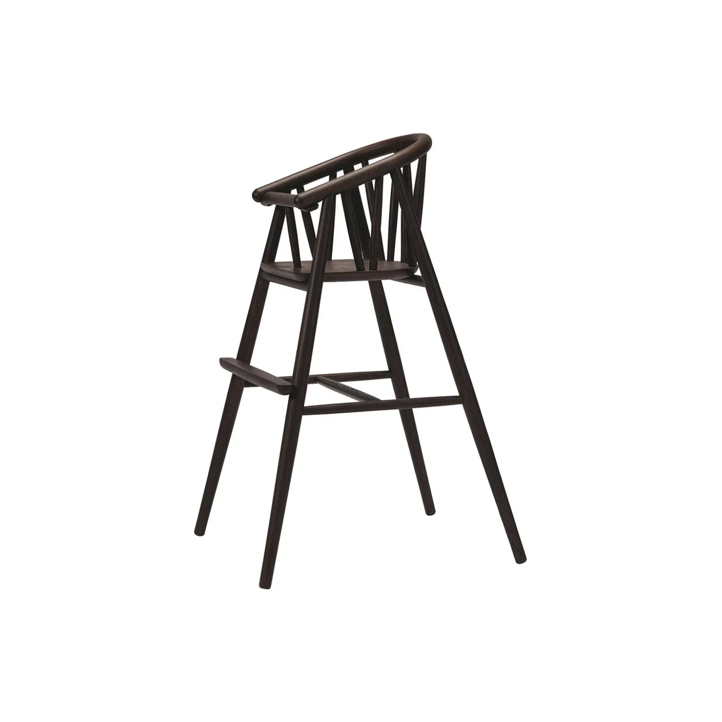Saga Højstolen er designet af den danske møbeldesigner, Nina Bruun i 2021. Stolen kan følge barnet i de første 6 år af barndommen, da den meget enkelt kan ændres til en åben juniorstol for større børn. Designet er skabt med inspiration fra den lange danske designtradition, der bygger på sublimt design, kompromisløst håndværk og en meget lang levetid. Stolen er håndsamlet i massiv eg af erfarne italienske snedkere. Den kurvede rygstøtte er udført i et stykke egetræ, der er dampbøjet i den smukke buede form, der kendetegner de organiske former på stolen. Stolen flugter smukt med højden på spiseborde og muliggør at barnet kan sidde helt tæt til bordet sammen med resten af familien.Ved køb af stolen medfølger en lille gavepose med et sæt messingskilte og messingskruer. Skiltet kan graveres med en personlig hilsen eller navnet på barnet og herefter monteres på undersiden af sædet. På den måde vil stolen bære en lille bid af historien med sig til de næste små brugere. Stolen overholder alle europæiske sikkerhedskrav og er godkendt efter den europæiske sikkerhedsstandard EN14988:2017+A1:2020Til børn fra ca. 6 måneder og op til 6 års-alderen.