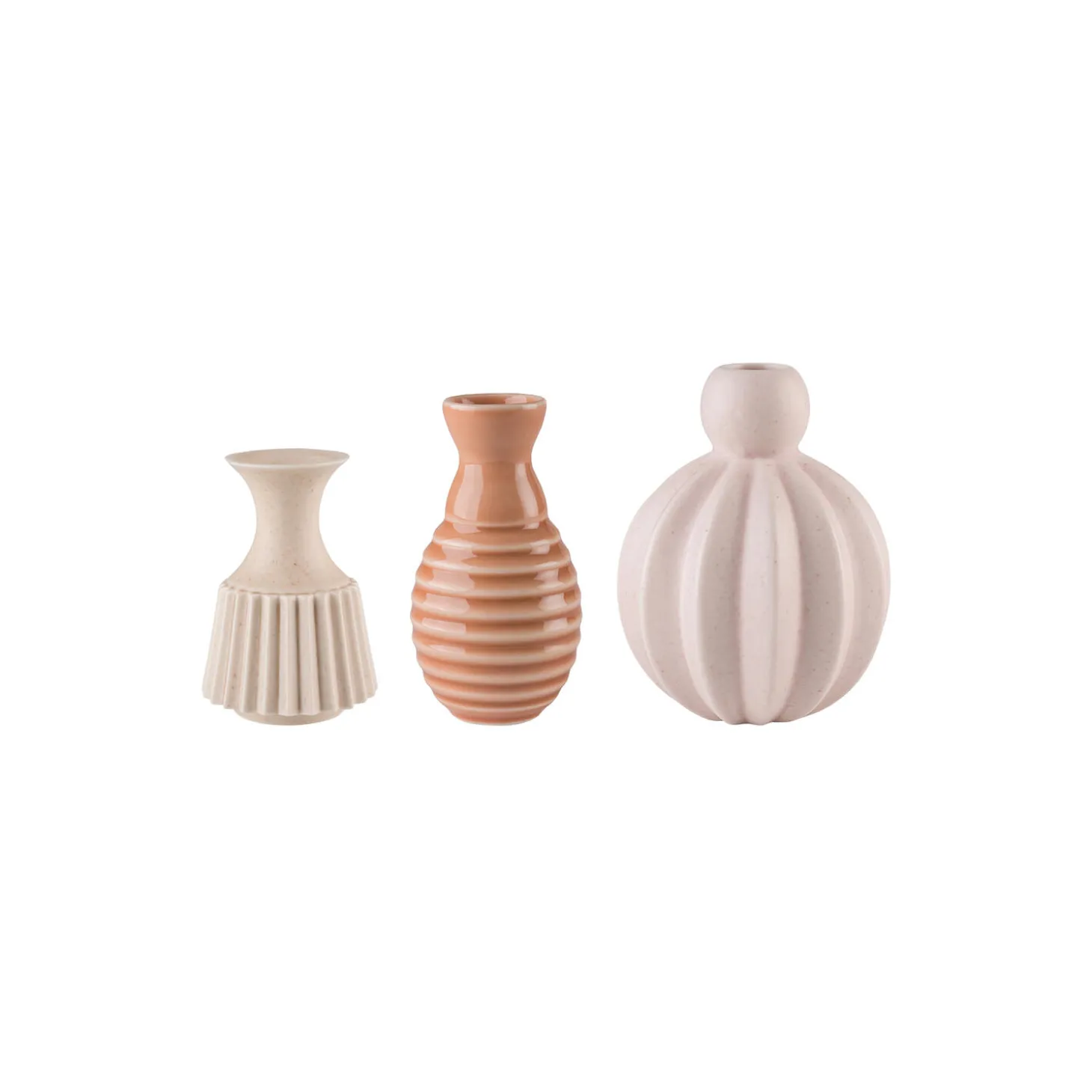 3 miniature vaser i smukke glasurer. De er perfekte til de små blomster, som børnene tit kommer ind med fra grøftekanten eller haven.