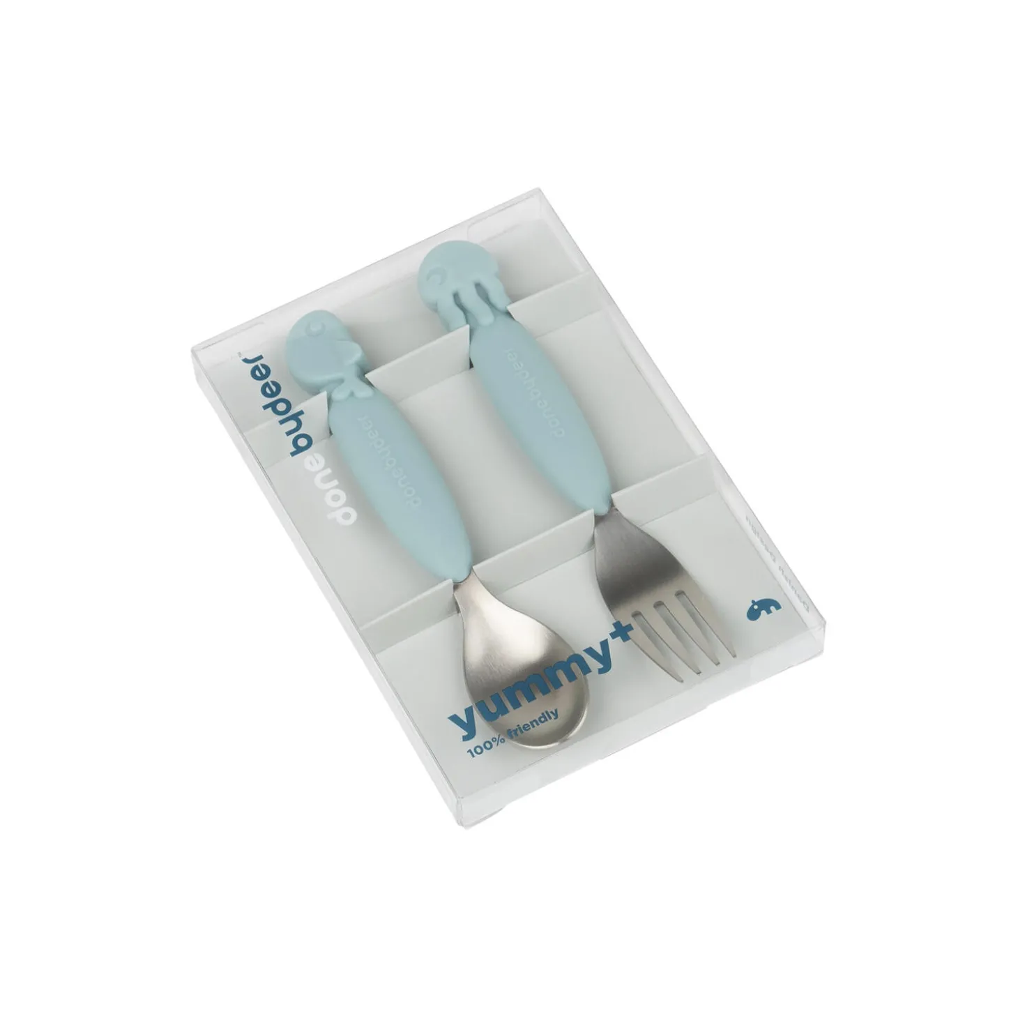 Sea Friends YummyPlus ske & gaffel sæt i rustfrit stål og 100% fødevarekvalitet silikone fra Done By Deer.Farve: blå. Mål: H: 1,3 x L: 14 x B: 3 cm.