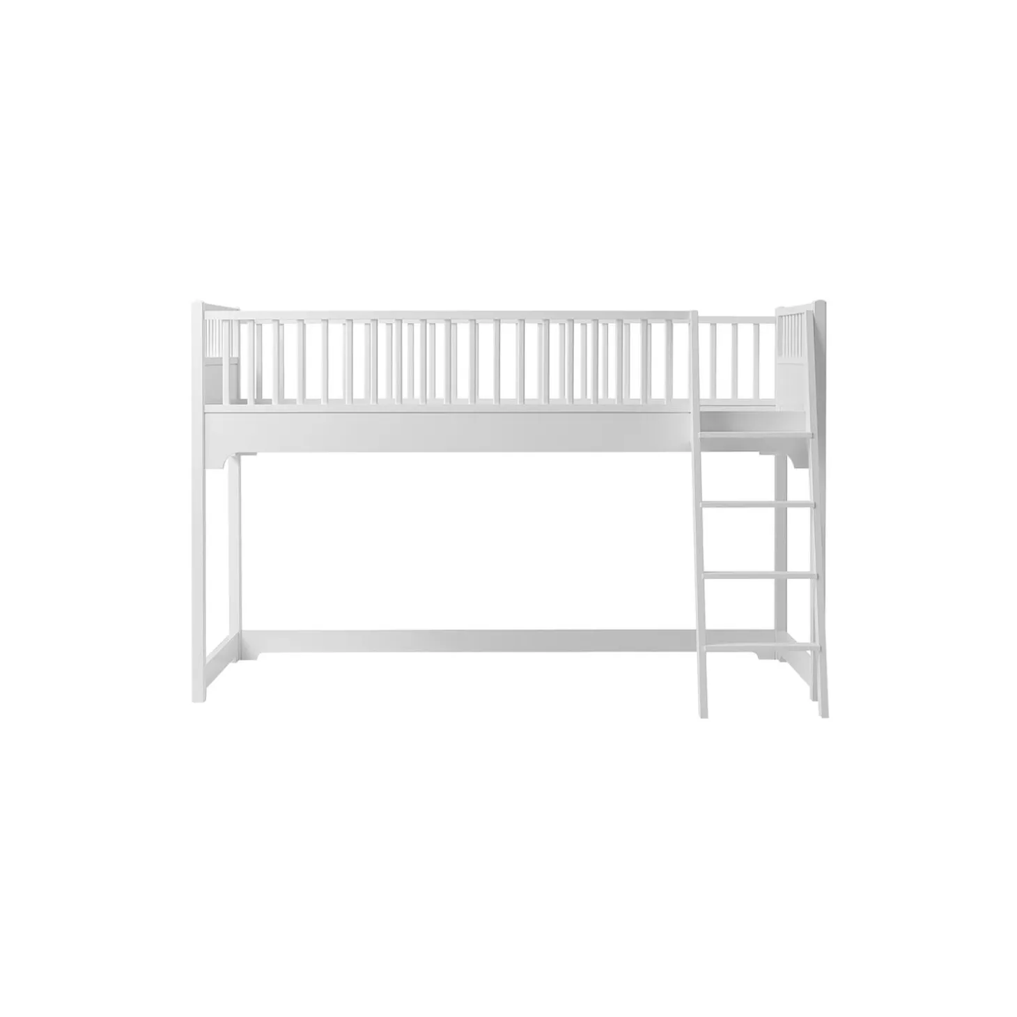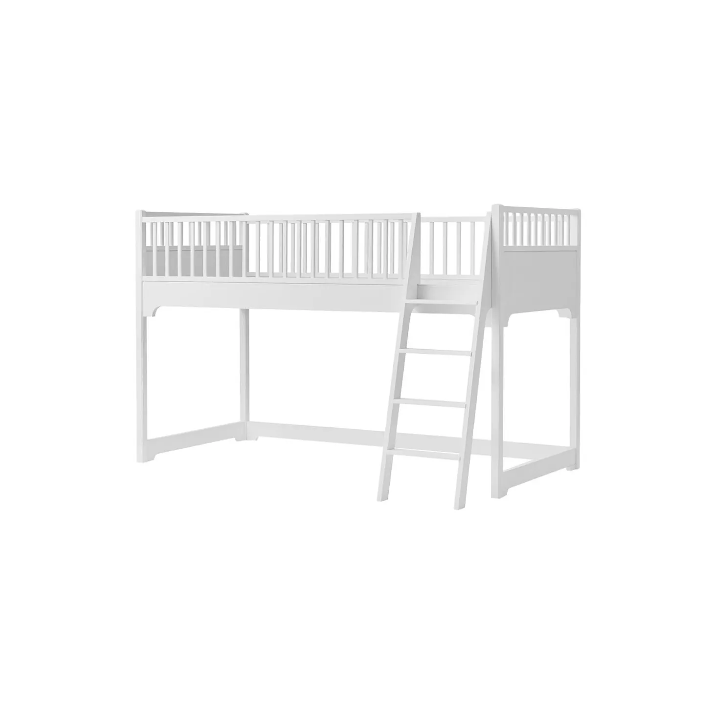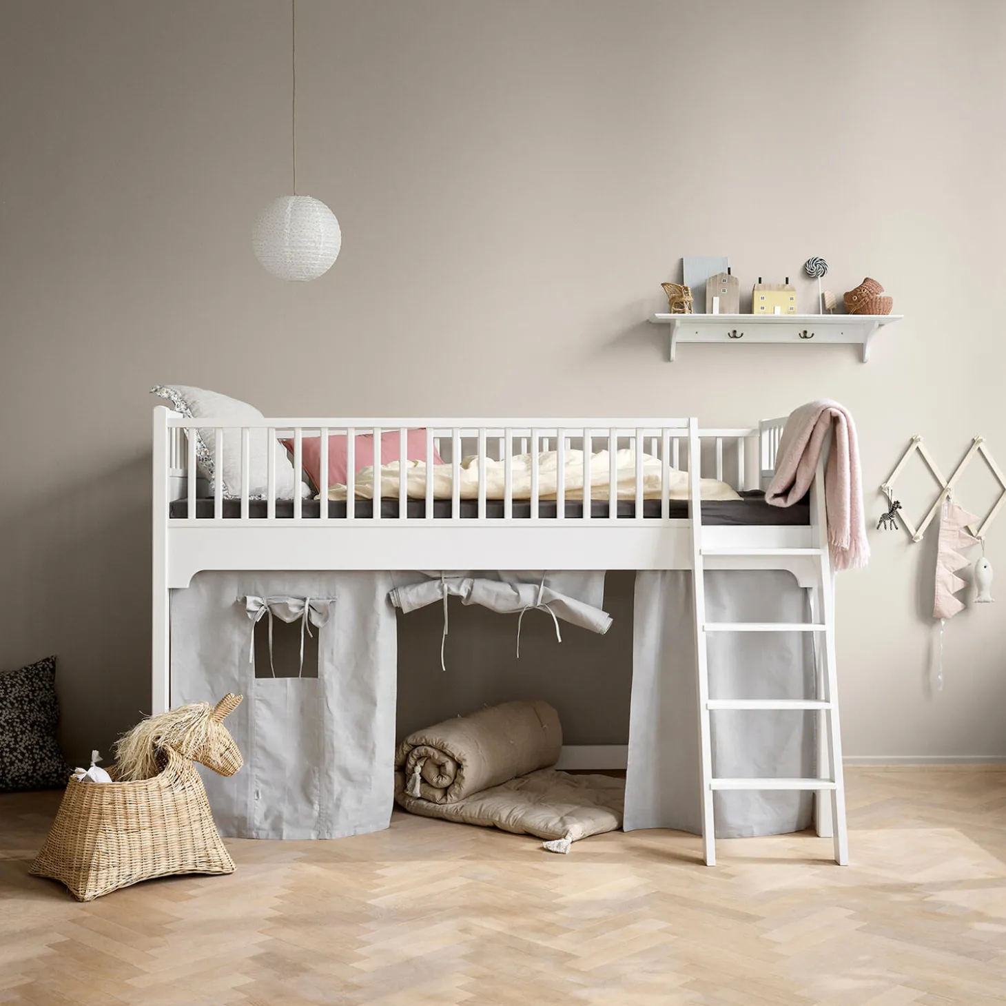 Den lave højseng er især god til det mindre barn, der gerne vil have fordelene ved en højseng uden at skulle kravle for højt op. Ved puttetid kan forældrene give godnatkys fra siden af sengen og undgå at kravle op.Under sengen er der mulighed for at indrette en hyggelig hule, fx ved at tilkøbe forhænget til sengen, der findes i forskellige designs. Her kan barnet invitere legekammeraten ind eller trække forhænget for, når der er behov for en lille pause fra hverdagen.Trinene på stigen er brede, så barnet let og sikkert kan komme op og ned. Stigen kan valgfrit placeres i enten venstre eller højre side.Sengen er en del af Seaside Classic serien, der er designet i en fin og nordisk stil. Små, enkle detaljer understreger det tidløse design, der passer ind i de fleste hjem.easide Classic serien er fremstillet af birketræ og MDF, der er konstrueret træ, der består af 60% birk, 20% fyrretræ og 20% asp træ. MDF er meget stærkt og holdbart.De ikke-synlige skruer giver sengen et rent og eksklusivt design og er særligt kendetegnende for Oliver Furniture. Designet er let og fint og holder fra generation til generation.Serien er produceret i Europa og overholder de strenge EU-krav for sikkerhed og sundhed. Produkterne er malet med ikke-giftig, vandbaseret maling.Bæreevne (statisk vægt): 120 kg SIKKERHED OG KRAVI henhold til EN 747 er højsenge og den øverste seng i køjesenge ikke egnet til børn under 6 år på grund af risikoen for fald.Et mindre barn kan sove i den nederste køjeseng, eventuelt med en sengehest for ekstra sikkerhed.