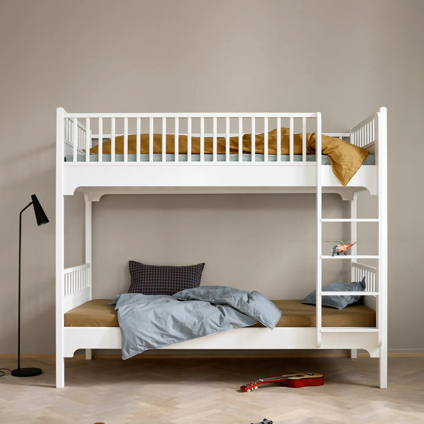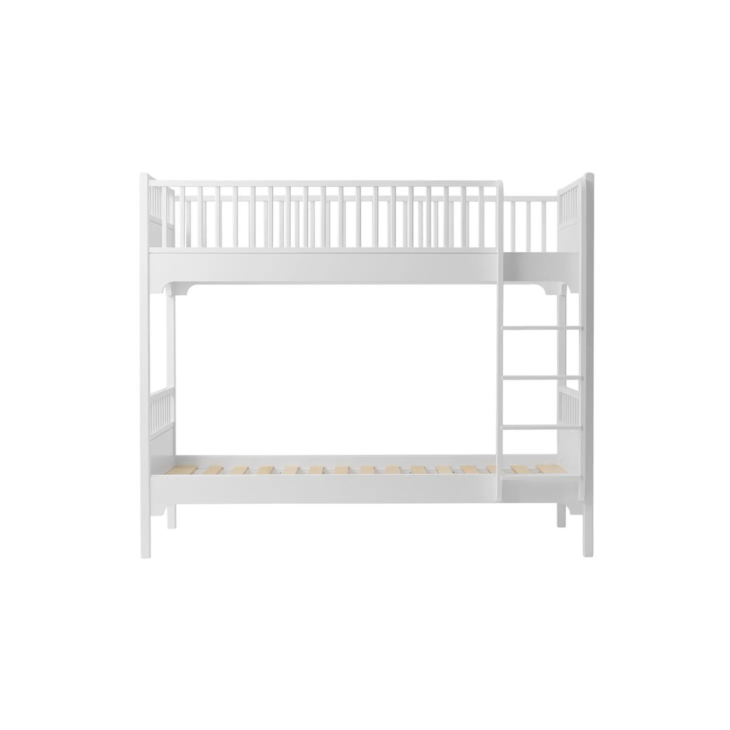 Smuk køjeseng med mange, praktiske løsninger. Her er sengen til børneværelset, hvor der er brug for lidt ekstra plads og lidt ekstra opbevaring.Den lige stige giver plads til en skuffe under sengen til ekstra opbevaring. Sengen kan udstyres med en udtræksseng, så legekammeraten let kan overnatte – ellers hvis mor skal være helt tæt på.Køjesengen fylder mindre i bredden end Seaside Classic køjesengen med skrå stige, da stigen er lodret. Det giver mere plads på børneværelset.Trinene på stigen er brede, så barnet let og sikkert kan komme op og ned. Stigen kan valgfrit placeres i enten venstre eller højre side.Køjesengen er en del af Seaside Classic serien, der er designet i en fin og nordisk stil. Små, enkle detaljer fx langs tremmerne understreger det tidløse design, der passer ind i de fleste hjem.Seaside Classic serien er fremstillet af birketræ og MDF, der er konstrueret træ, der består af 60% birk, 20% fyrretræ og 20% asp træ. MDF er meget stærkt og holdbart.De ikke-synlige skruer giver sengen et rent og eksklusivt design og er særligt kendetegnende for Oliver Furniture. Designet er let og fint og holder fra generation til generation.Serien er produceret i Europa og overholder de strenge EU-krav for sikkerhed og sundhed. Produkterne er malet med ikke-giftig, vandbaseret maling.Bæreevne (statisk vægt): 120 kg SIKKERHED OG KRAVI henhold til EN 747 er højsenge og den øverste seng i køjesenge ikke egnet til børn under 6 år på grund af risikoen for fald.Et mindre barn kan sove i den nederste køjeseng, eventuelt med en sengehest for ekstra sikkerhed.