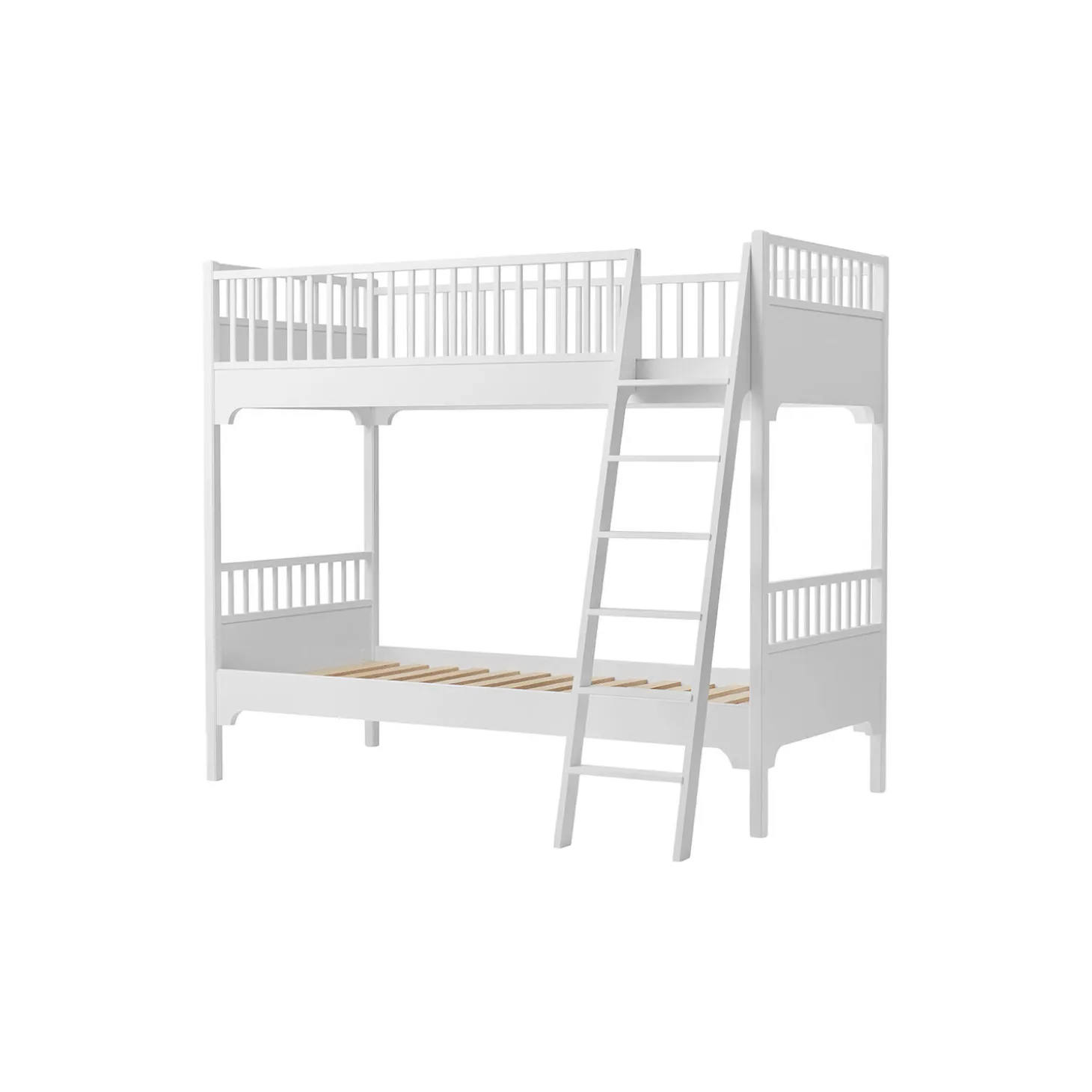 En køjeseng er lig med hygge og masser af leg. Det er nærmest magisk for barnet at kravle helt op under loftet ad stigen ved sengetid – som var det en hule i et træ. Her kan man ikke være andet end tryg.Køjesengen inviterer til samvær, for her er plads til kammeraten, der skal overnatte eller til søskende, der gerne vil være helt tæt på hinanden.Samtidig er køjesengen en praktisk løsning til børneværelset, hvor der skal være plads til leg. Der kan fx laves en hyggelig hule under køjesengen ved at tilkøbe et forhæng.Stigen er skrå og trinene brede, så barnet let og sikkert kan komme op og ned. Stigen kan valgfrit placeres i enten venstre- eller højre side.Køjesengen er en del af Seaside Classic serien, der er designet i en fin og nordisk stil. Små, enkle detaljer understreger det tidløse design, der passer ind i de fleste hjem.Seaside Classic serien er fremstillet af birketræ og MDF, der er konstrueret træ, der består af 60% birk, 20% fyrretræ og 20% asp træ. MDF er meget stærkt og holdbart.De ikke-synlige skruer giver sengen et rent og eksklusivt design og er særligt kendetegnende for Oliver Furniture. Designet er let og fint og holder fra generation til generation.Serien er produceret i Europa og overholder de strenge EU-krav for sikkerhed og sundhed. Produkterne er malet med ikke-giftig, vandbaseret maling.Bæreevne (statisk vægt): 120 kg SIKKERHED OG KRAVI henhold til EN 747 er højsenge og den øverste seng i køjesenge ikke egnet til børn under 6 år på grund af risikoen for fald.Et mindre barn kan sove i den nederste køjeseng, eventuelt med en sengehest for ekstra sikkerhed.