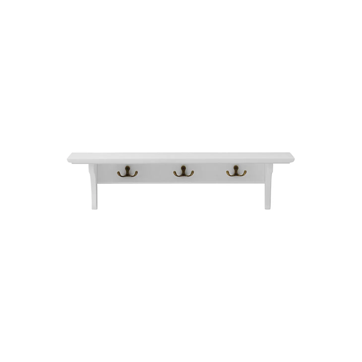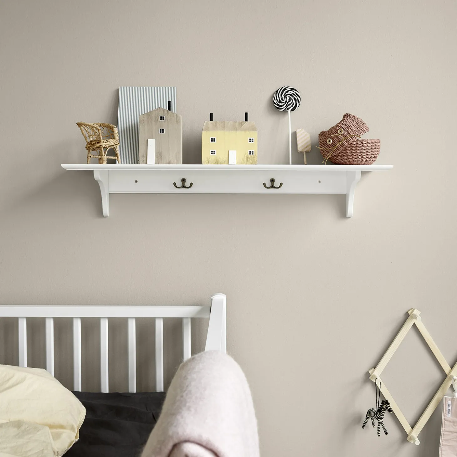 Enkel hylde til børneværelset. Hylderne findes i forskellige længder og dybder, hvilket gør dem interessante at kombinere. Krogene medfølger og kan monteres efter eget valg.Produktet er fremstillet af birketræ og MDF, der er konstrueret træ, der består af 60% birk, 20% fyrretræ og 20% asp træ. MDF er meget stærkt og holdbart.De ikke-synlige skruer giver et rent og eksklusivt design og er særligt kendetegnende for Oliver Furniture. Designet er let og fint og holder fra generation til generation.Produktet er produceret i Europa og overholder de strenge EU-krav for sikkerhed og sundhed. Produktet er malet med ikke-giftig, vandbaseret maling.