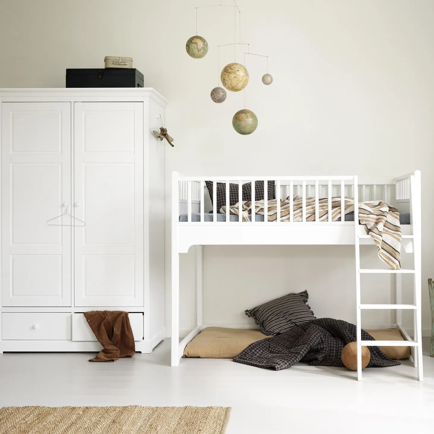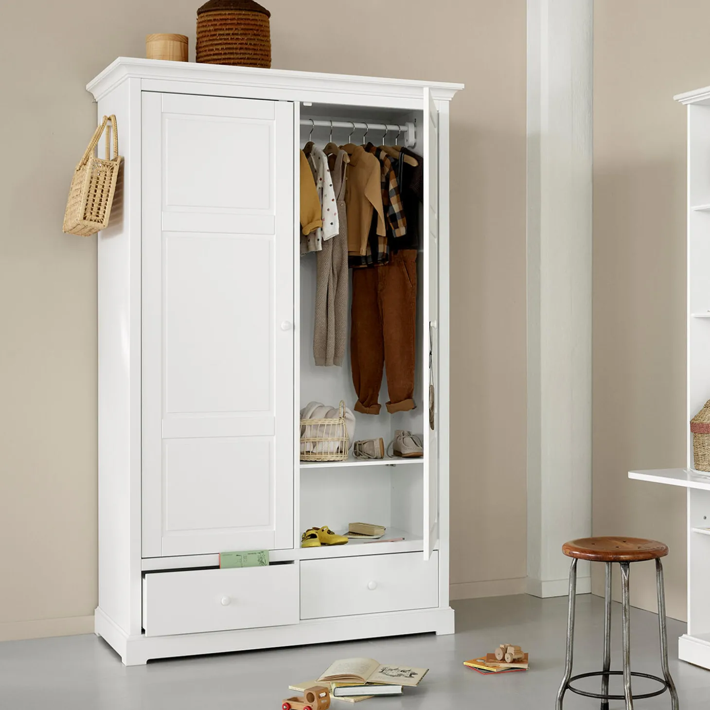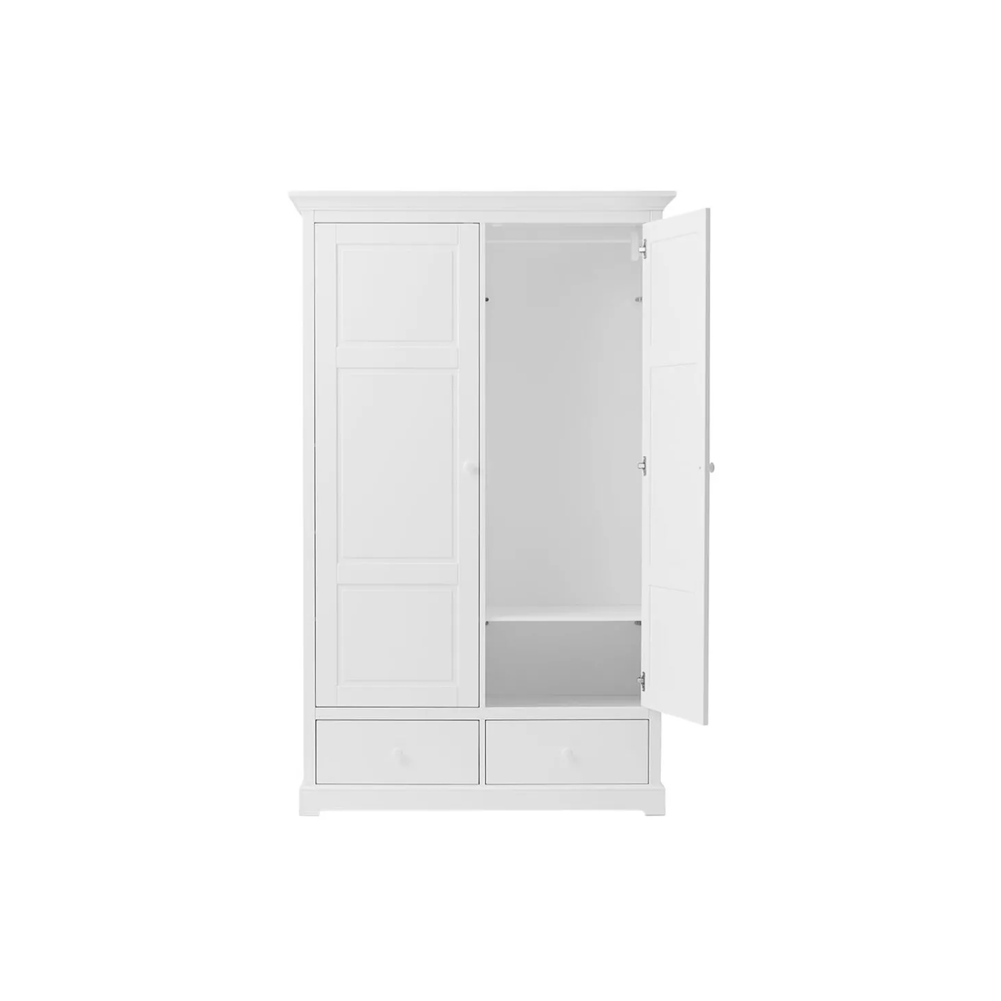 Smukt og klassisk klædeskab med mange, gode opbevaringsmuligheder til børneværelset.Skabets indretning er fleksibel med flytbare hylder, dybe skuffer og en gennemgående bøjlestang. Her er plads til alt fra sengetøj, tøj og legetøj.Klædeskabet har skuffeskinner af høj kvalitet, og både skinner og hængsler på dørene har soft close.Som en ekstra, lille detalje kan der skydes en bøjleknage ud på klædeskabets sidegavle. Her kan man hænge yndlingskjolen, sværdet eller andre fine ting, der gerne må vises frem.Klædeskabet kan også bruges i forældrenes soveværelse eller i entreen til jakker, sko og huer.Skabet er en del af Seaside Collection, der kendetegnes af en klassisk nordisk lethed. Med sit elegante, tidløse udtryk og den høje kvalitet, bliver det let en favorit fra generation til generation.Seaside klædeskabe er fremstillet af MDF, der er konstrueret træ, der består af 60% birk, 20% fyrretræ og 20% asp træ. MDF er meget stærkt og holdbart.De ikke-synlige skruer giver skabet et rent og eksklusivt design og er særligt kendetegnende for Oliver Furniture. Designet er charmerende og meget klassisk. Inspirationen er hentet fra nordiske møbeltraditioner og holder fra generation til generation. Både skuffeskinner og hængsler på dørene har soft close, så små fingre ikke bliver klemt.Produktet er produceret i Europa og overholder de strenge EU-krav for sikkerhed og sundhed. Produktet er malet med ikke-giftig, vandbaseret maling.