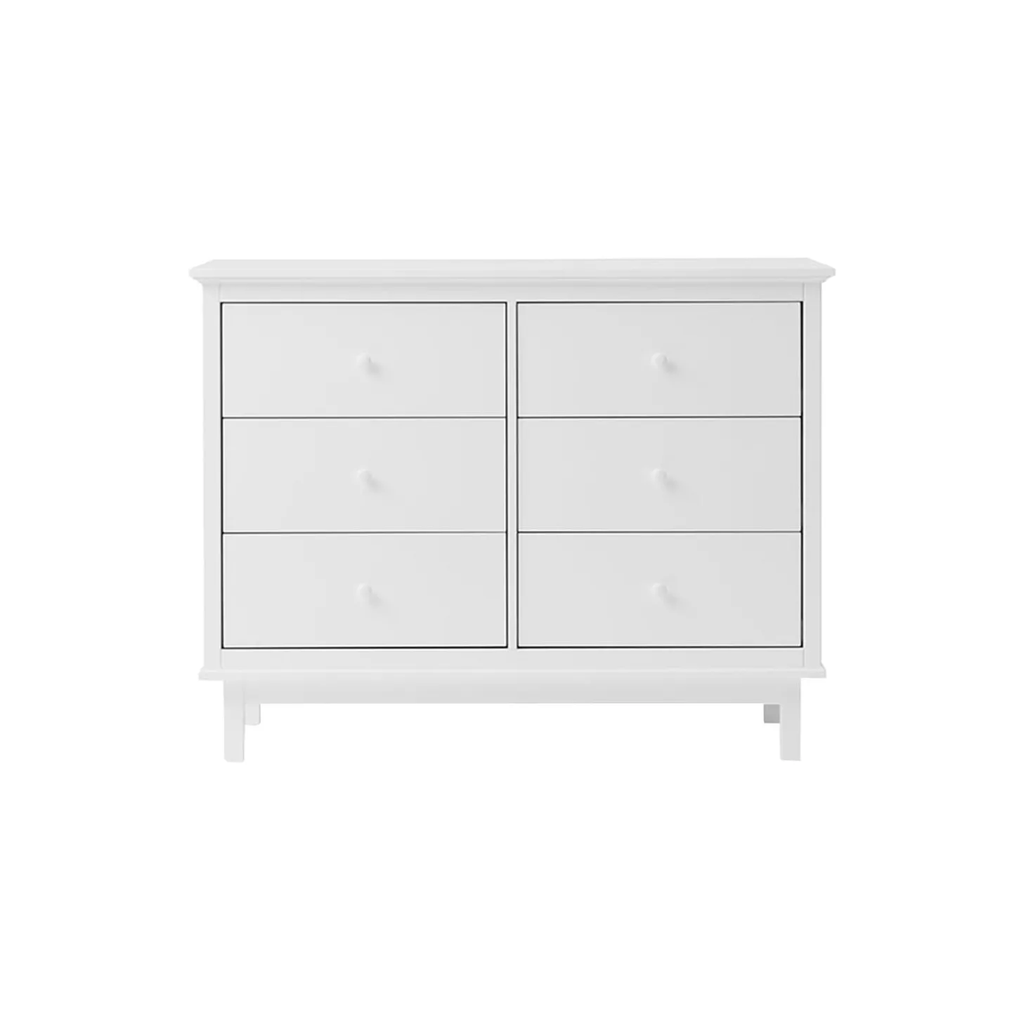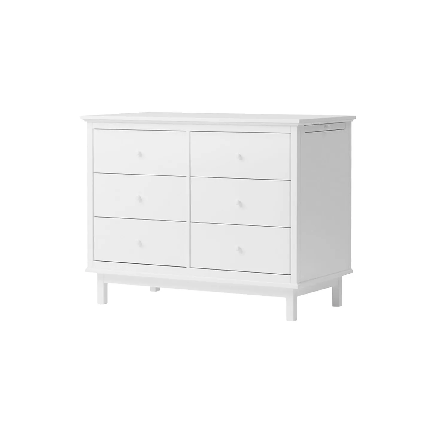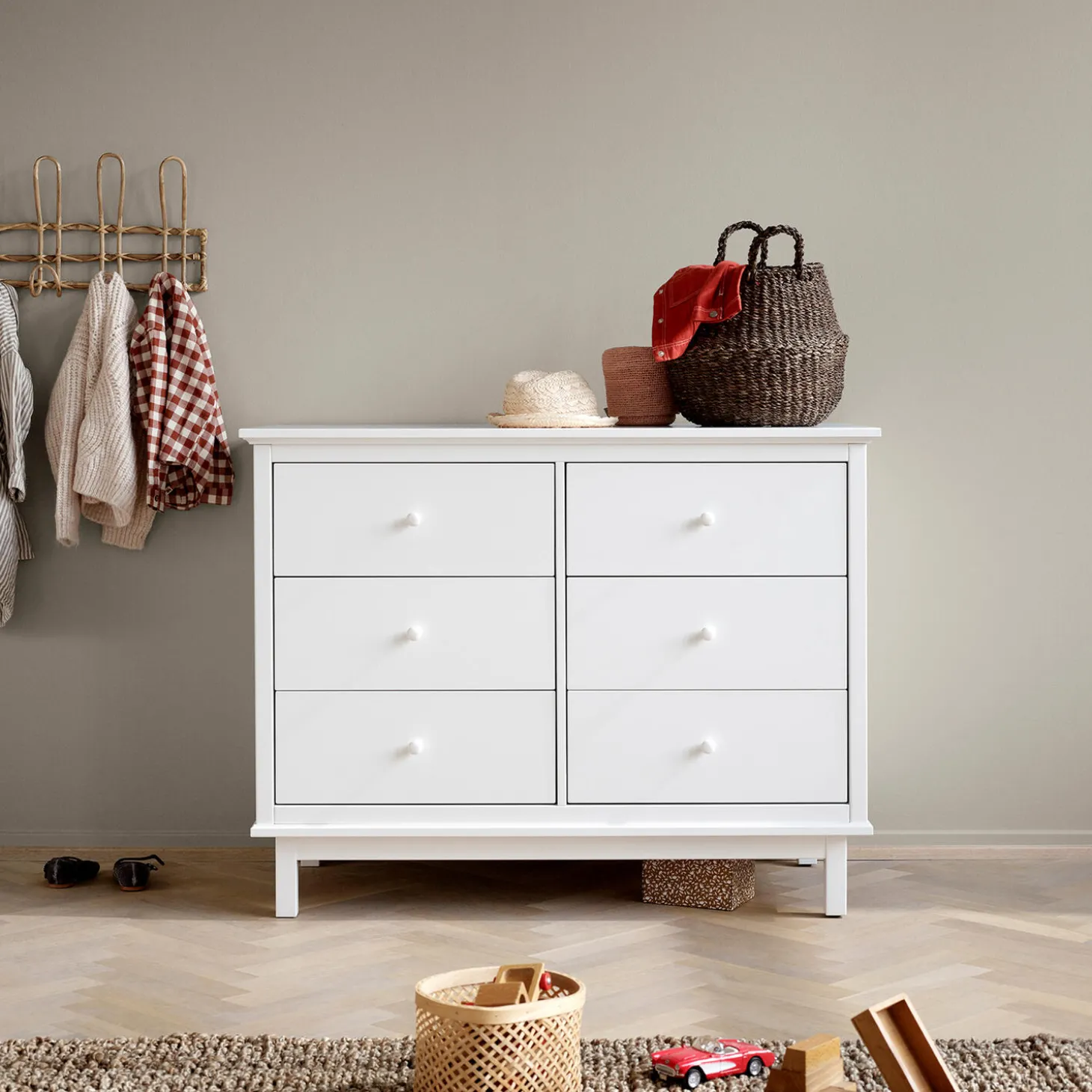 Seaside kommode med 6 skuffer er i sit enkle design det oplagte møbel til opbevaring på børneværelset eller andre steder i boligen, hvor der er behov for opbevaringsplads. De seks rummelige skuffer er designet til at imødekomme behovet for plads til alt fra tøj til bleer, bøger og legetøj, og tilbyder i sine generøse mål, at alt barnets udstyr kan samles ét sted. Skufferne kører ubesværet på skinner af høj kvalitet, og den særlige ‘soft-lock’-funktion sikrer, at skufferne lukker langsomt og lydløst i.Kommodens klassiske former og skuffefronternes fine greb af porcelæn tilfører kommoden et strejf af nostalgisk finesse. Kommodens enkle formsprog gør den nem at placere i et øvrigt interiør, hvor den føles på en gang traditionel og moderne, elegant og uhøjtidelig.Seaside puslekommode kan ved tilkøb udstyres med to udtræk, der kan integreres under toppladen: et udtræk er med små tremmer, som kan bruges til at hænge eller stille ting på (10 tøjklemmer inkluderet), mens det andet er designet som en holder til den medfølgende vasketøjspose. Produktet er fremstillet af birketræ og MDF, der er konstrueret træ, der består af 60% birk, 20% fyrretræ og 20% asp træ. MDF er meget stærkt og holdbart.De ikke-synlige skruer giver et rent og eksklusivt design og er særligt kendetegnende for Oliver Furniture. Designet er let og fint og holder fra generation til generation.Produktet er produceret i Europa og overholder de strenge EU-krav for sikkerhed og sundhed. Produktet er malet med ikke-giftig, vandbaseret maling.