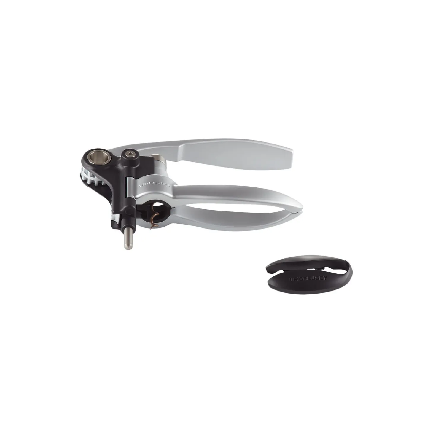 Selvoptrækkende proptrækker med folieskærer i metal og non-stick belægning fra Le Creuset.