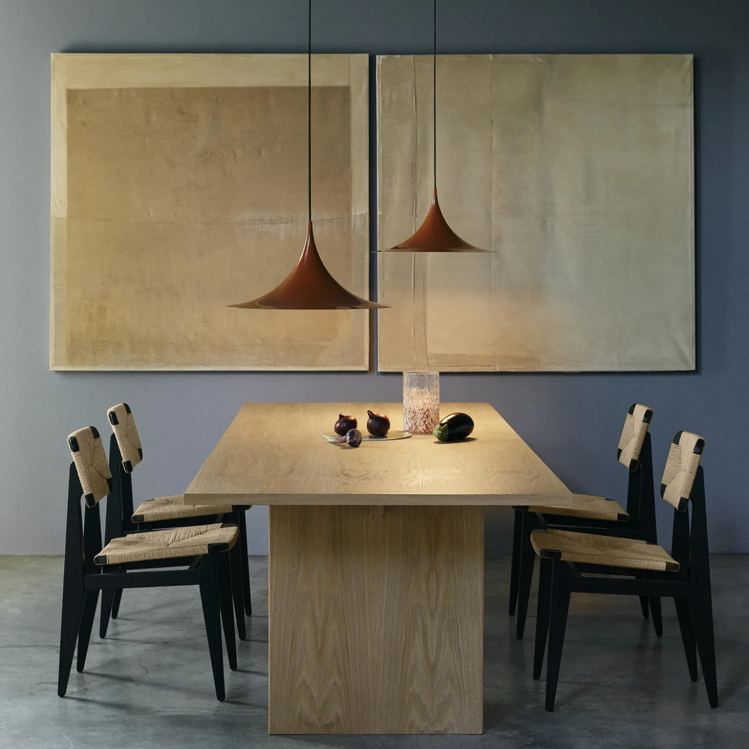 Semi Pendant i lakeret aluminium fra GUBI. Farve: roasted pumpkin glossy. Mål: H: 22 x Ø 30 cm. Lyskilde: 6-10W LED E27. Design: Bonderup & Thorup.