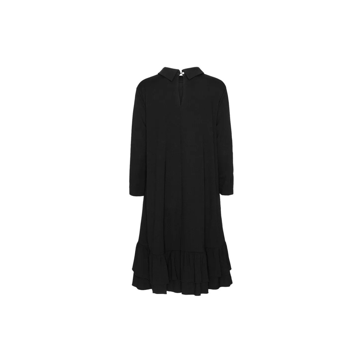 This A-line dress features long sleeves, two rows of ruffles at the hem, and hidden side pockets for practicality. The reversed collar with a small metal gold button and slit at back neck add refined details, making it perfect for both casual and special occasions.
