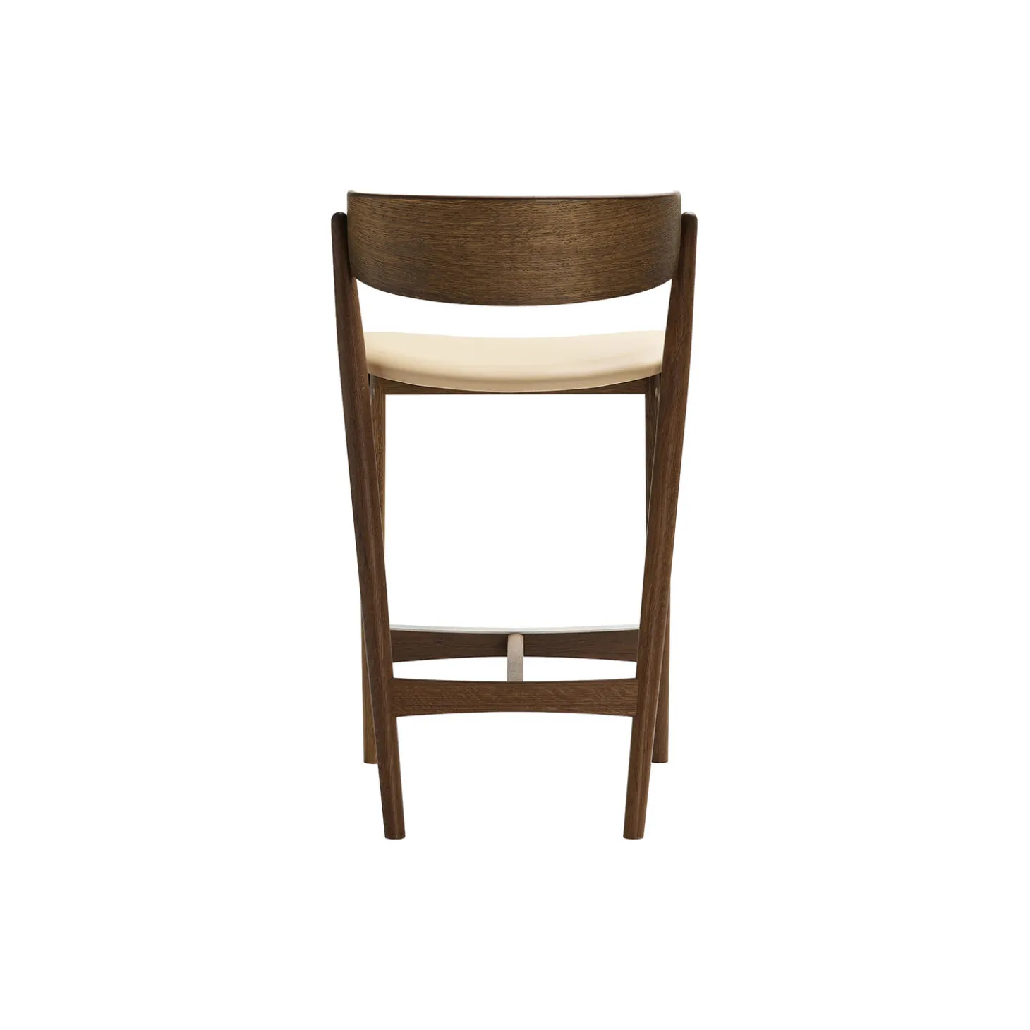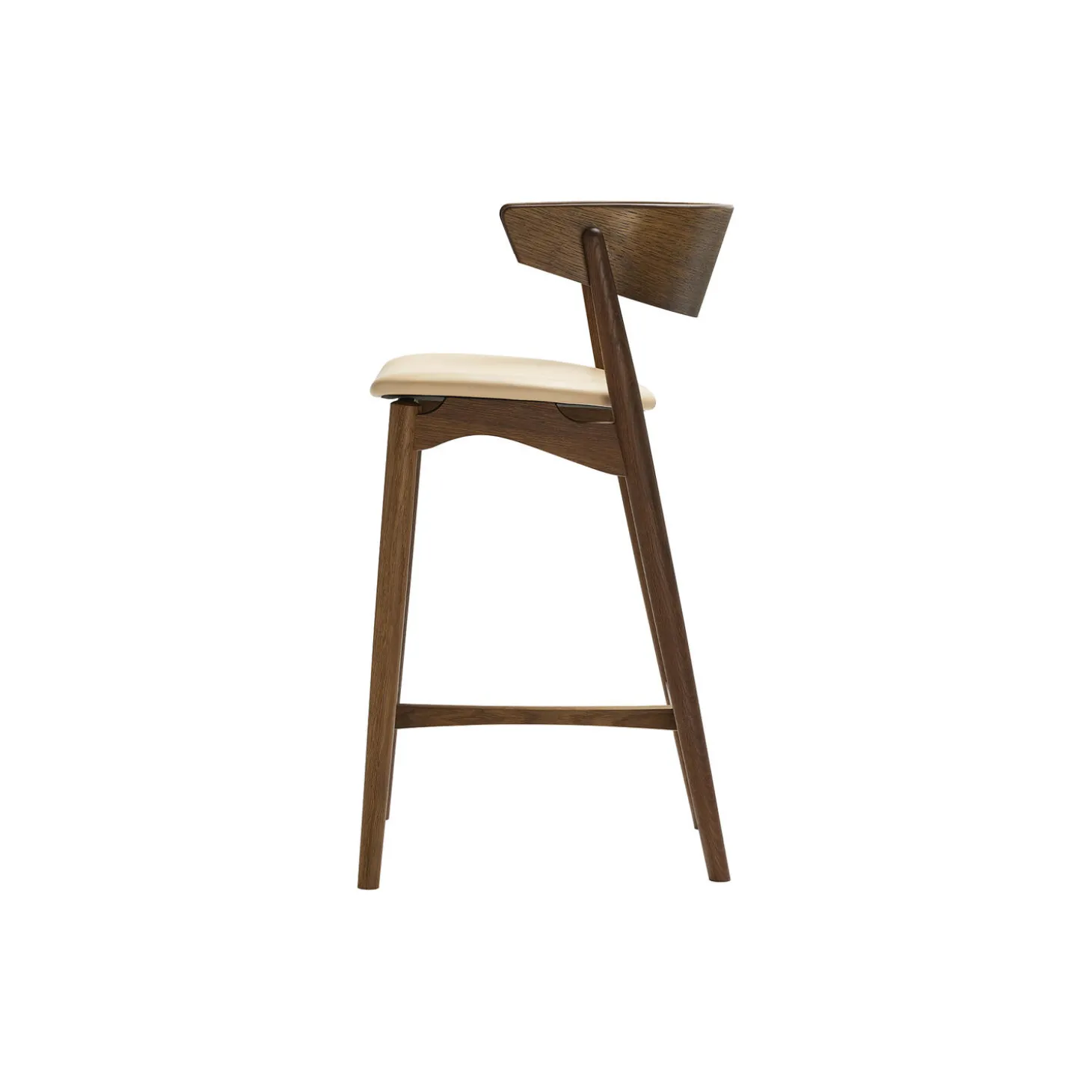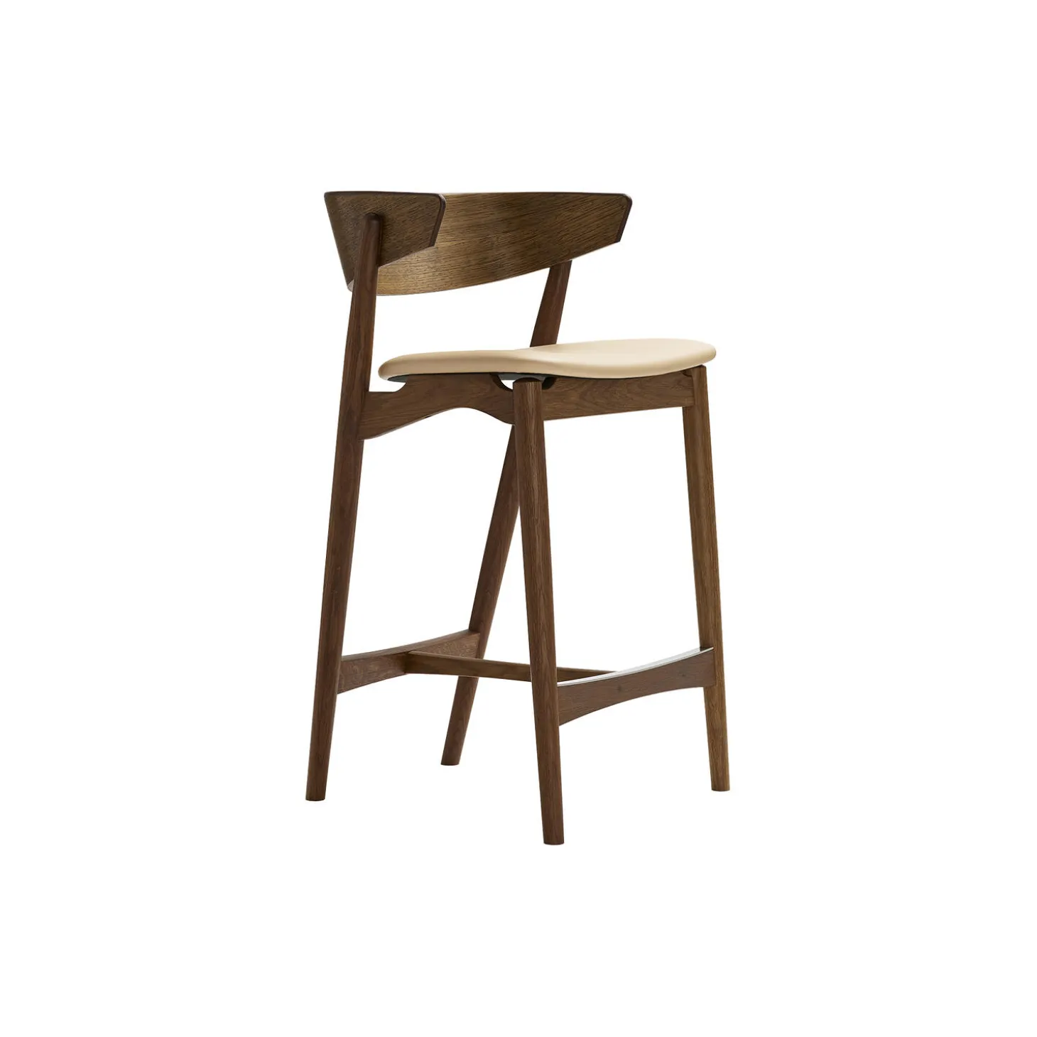 Sibast No 7 barstol i røget olieret eg med sæde i Spectrum semianilinlæder af Sørensen Leather fra Sibast Furniture. Farve: honey. Mål: 90×54 cm. Siddehøjde: 65 cm. Design: Anna & Ditlev Sibast.