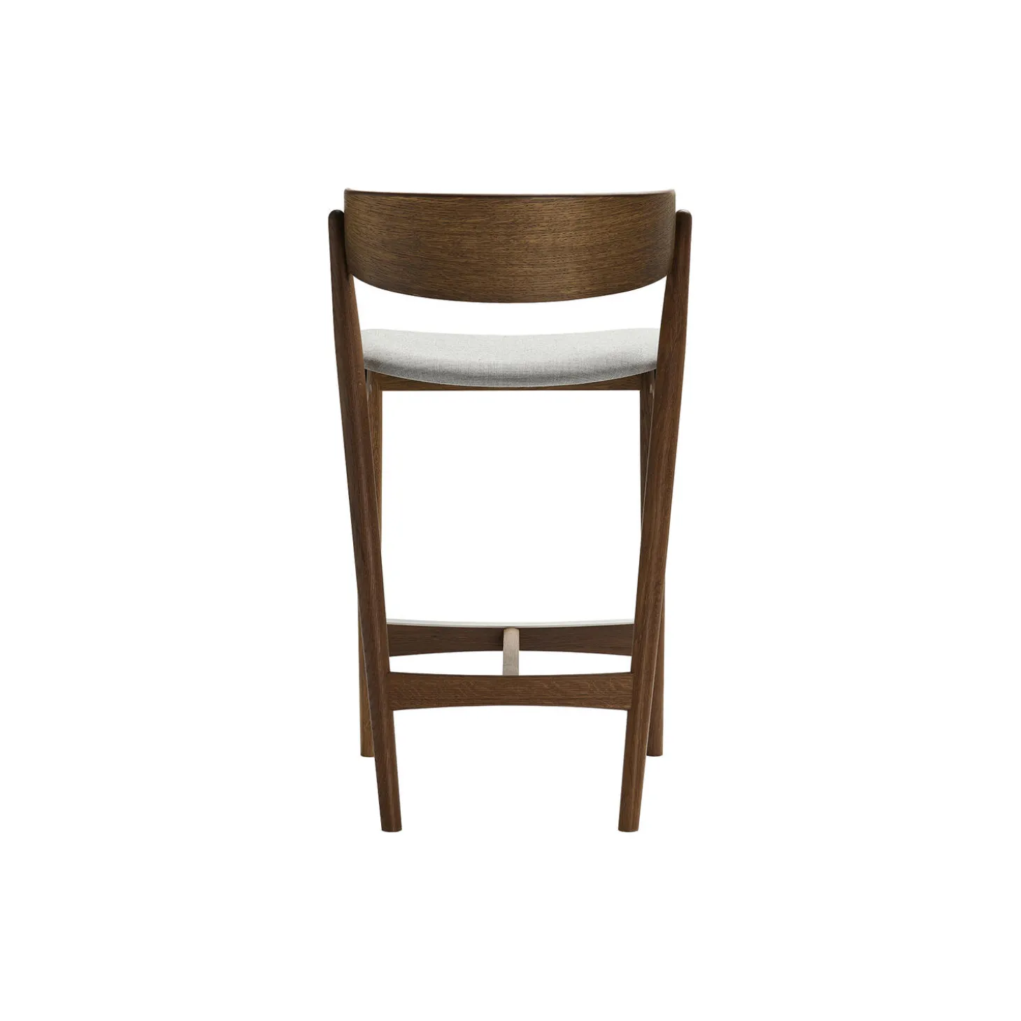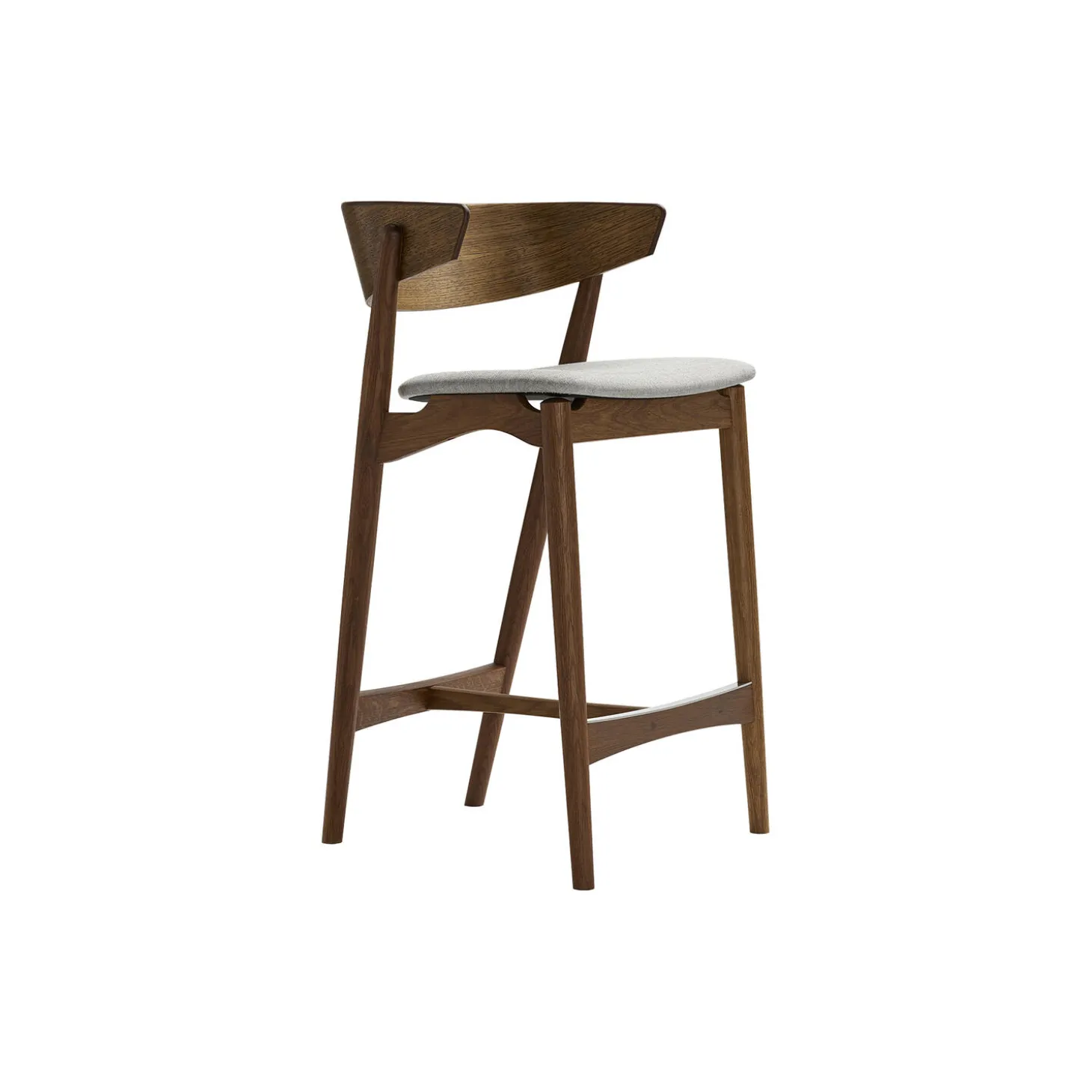 Sibast No 7 barstol i røget olieret eg med sæde i 123 Remix tekstil af Kvadrat fra Sibast Furniture. Farve: lysegrå. Mål: 90×54 cm. Siddehøjde: 65 cm. Design: Anna & Ditlev Sibast.