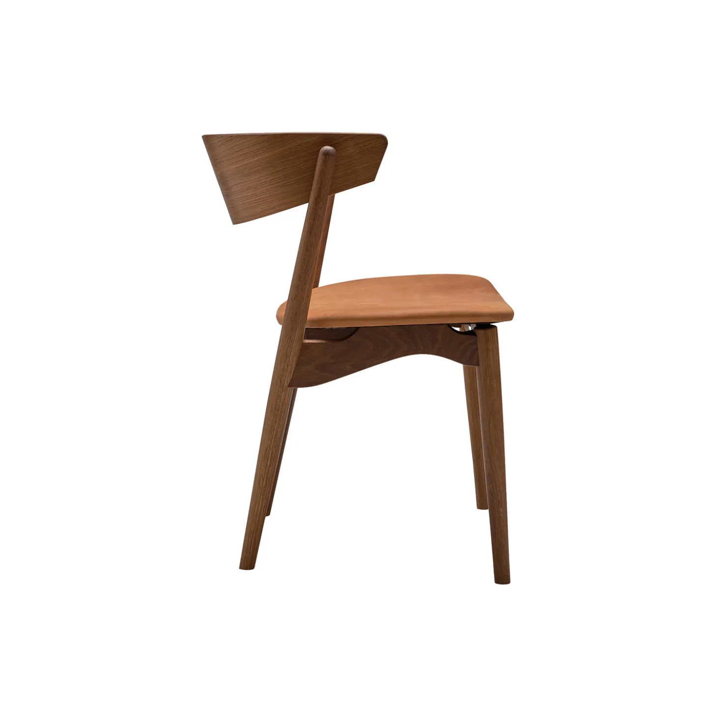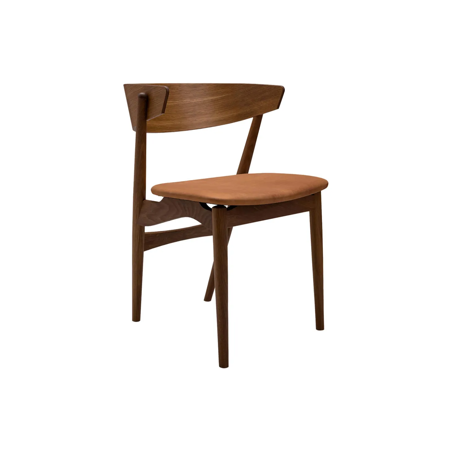 Sibast No 7 spisestol i røget eg med sædepolstring i Dunes anilinlæder af Sørensen Leather fra Sibast Furniture. Farve: cognac. Mål: H: 73,5 x B: 54 x D: 53 cm. Siddehøjde: 45 cm. Design: Helge Sibast.