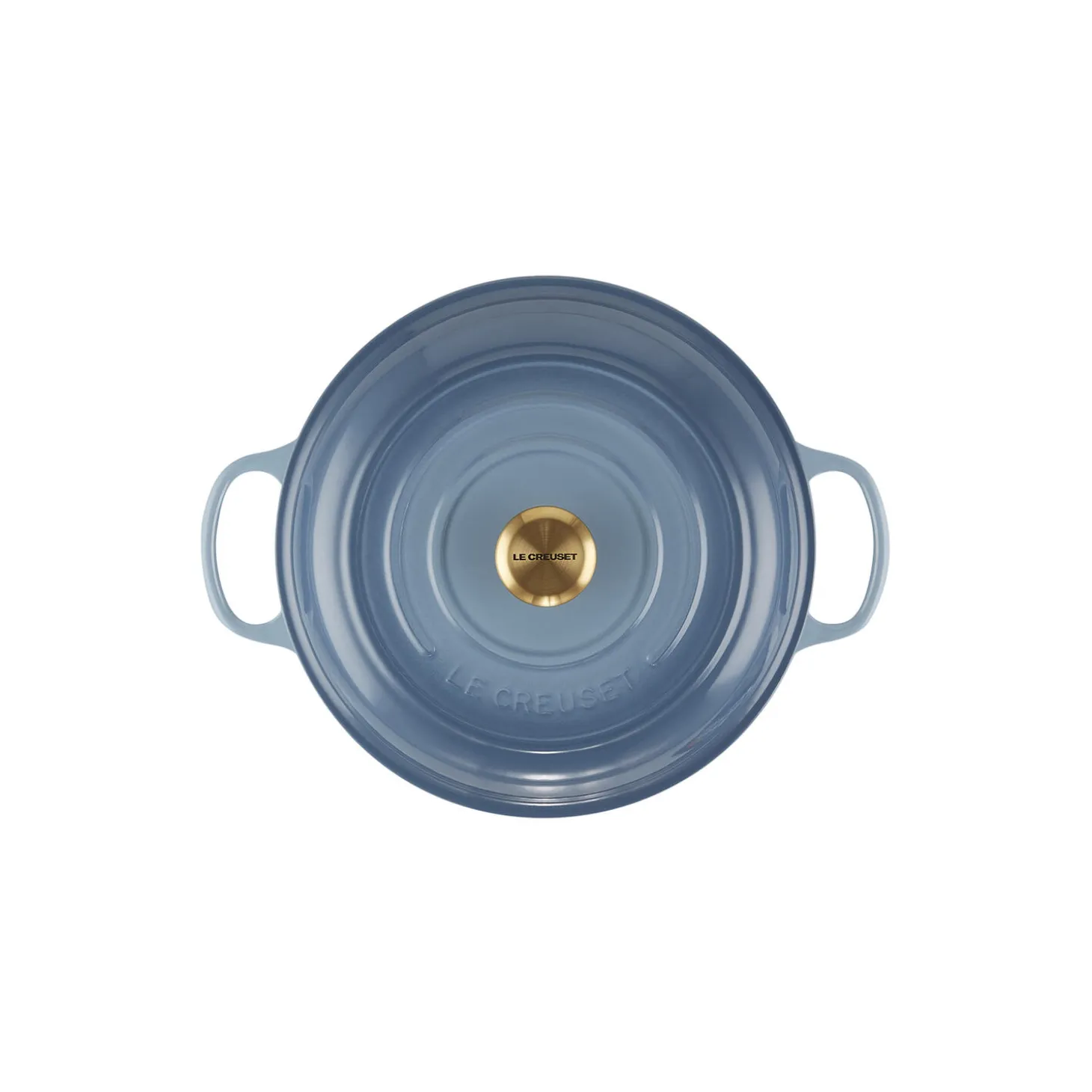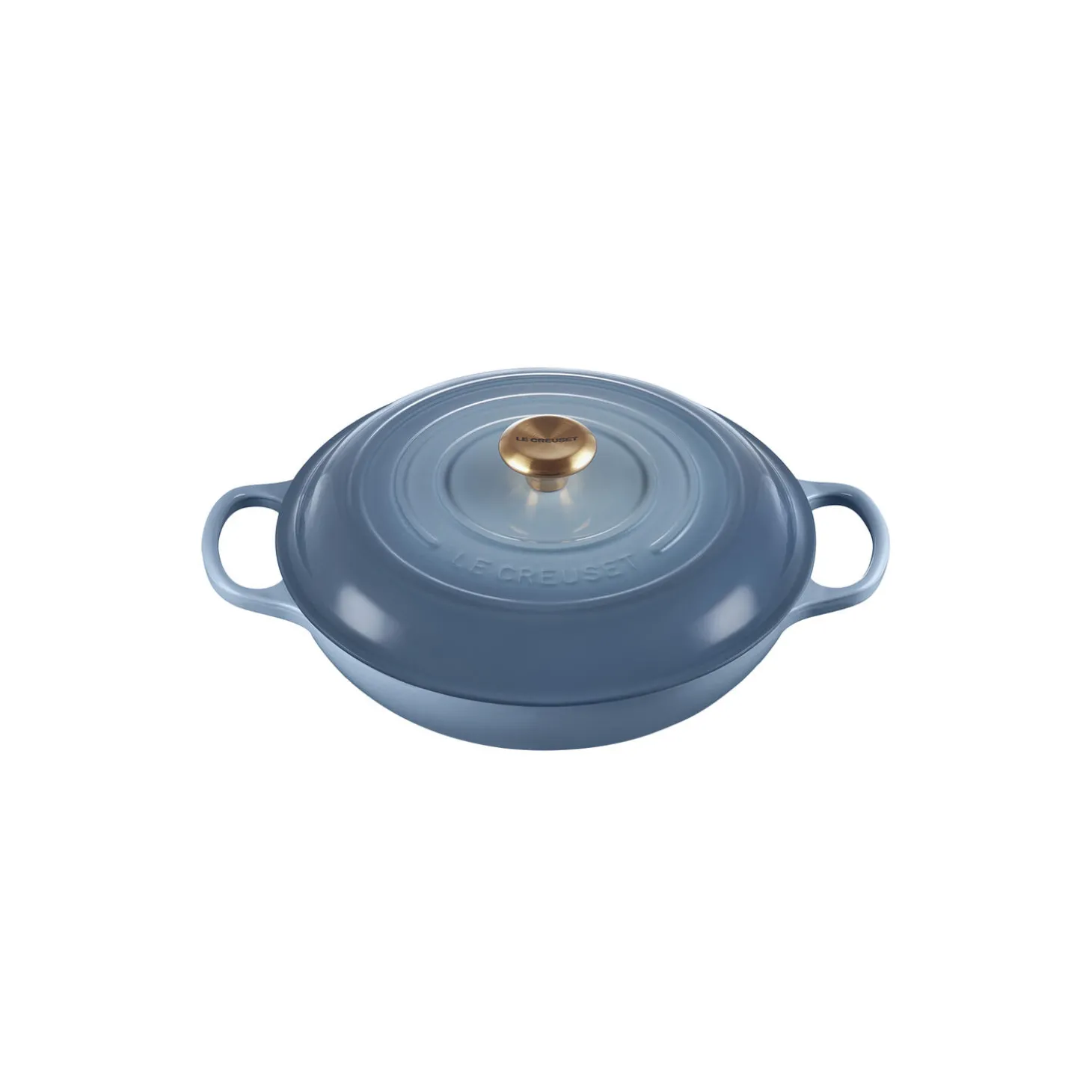 Vores støbejernsprodukter fremstilles på vores eget franske støberi og er vaskeægte køkkenlegender. Denne buffetgryde er ingen undtagelse. Den store, flade form og de lave kanter gør den perfekt til at brune kød og grøntsager, simre gryderetter, lynstege og bage. Den karamelliserer maden effektivt, så du får velsmagende resultater. Låg med rustfri stål- eller fenolknop tåler opvaskemaskine. Låg med guld-, iriserende-, kobber- og sort nikkelknop skål håndvaskes for at bevare deres finish. Egnet til følgende varmekilder: ovnens grill, ovn, elektrisk, keramisk kogeplade, gas og induktion.