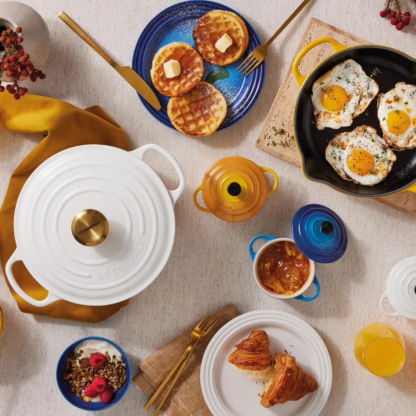 Le Creuset-gryden er en kulinarisk klassiker, som har været elsket af kokke i hele verden i næsten et århundrede. Denne klassiker er perfekt til stuvninger, stege, supper, gryderetter og bagning. Du behøver kun dette ene, ikoniske produkt til alle dine forskellige og mindeværdige måltider, der får tænderne til at løbe i vand. Låg med rustfri stål- eller fenolknop tåler opvaskemaskine. Låg med guld-, iriserende-, kobber- og sort nikkelknop skål håndvaskes for at bevare deres finish.