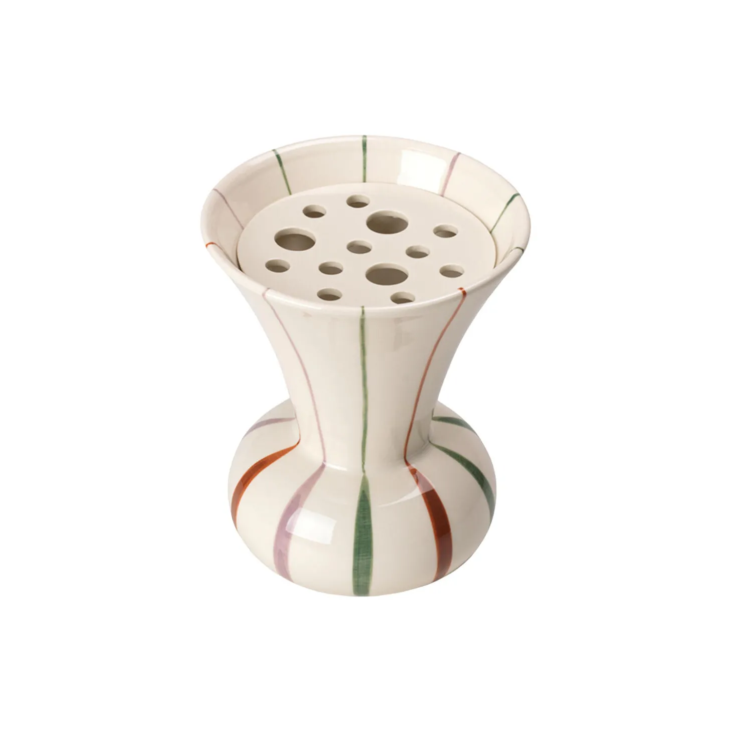 Med naturen som inspirationskilde har MeyerLavigne skabt to nye vaser for Kähler med en unik blomstertragt lignede form. Vasen har medfølgende keramikplade med huller inspireret at lotusplantens frøstand, der gør det muligt at arrangere blomsterne præcis, som man vil have dem. Vasen kan naturligvis også bruges på traditionel vis uden pladen til en almindelig bundet buket. Vasen er lavet i stentøj, og som Kählers håndværksmæssige tradition foreskriver det, er vaserne håndmalede og har liv, dynamik og autenticitet i udtrykket. Vasen er dekoreret med striberne der starter brede på den runde del af vasen og bliver tynde og fine på den tragtformede del. Striberne er i mosgrønne, terracotta og lilla afdæmpede farver, der smukt komplementerer hinanden. Design MeyerLavigne