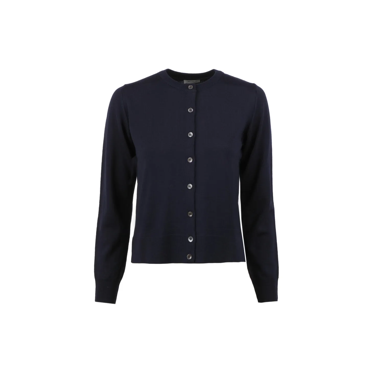 Denne cardigan er fremstillet i merinould og har perlemorsknapper, ribstrikket krave, manchetter og kant forneden.