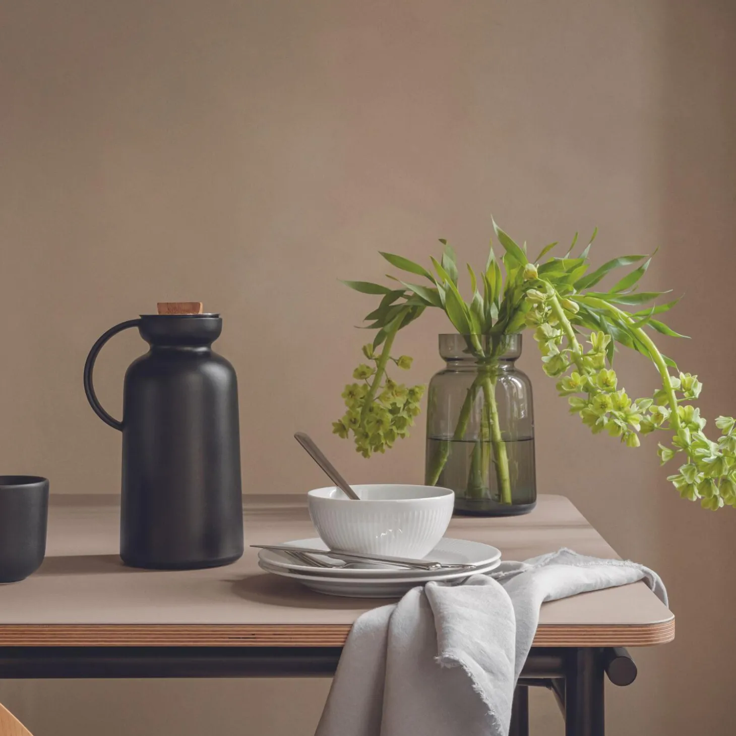 Bag Silhouettes indbydende ydre gemmer sig en indsats af stål, som gør termokanden robust og hårdfør, og så tåler den tilmed maskinopvask (dog ikke låget, der skal tørres med en opvredet klud). Termokanden holder på varmen i timevis, og en praktisk hældekrave af stål forhindrer indholdet i at dryppe på bordet. Egetræet vedligeholdes ved regelmæssig oliering.