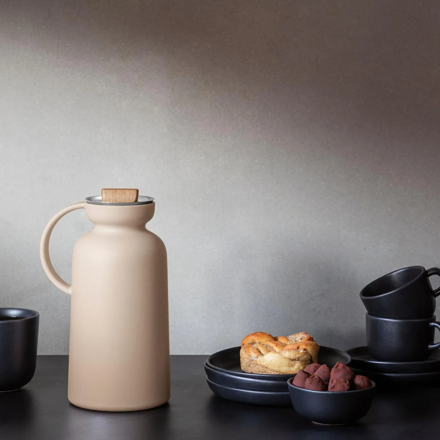 Bag Silhouettes indbydende ydre gemmer sig en indsats af stål, som gør termokanden robust og hårdfør, og så tåler den tilmed maskinopvask (dog ikke låget, der skal tørres med en opvredet klud). Termokanden holder på varmen i timevis, og en praktisk hældekrave af stål forhindrer indholdet i at dryppe på bordet. Egetræet vedligeholdes ved regelmæssig oliering.
