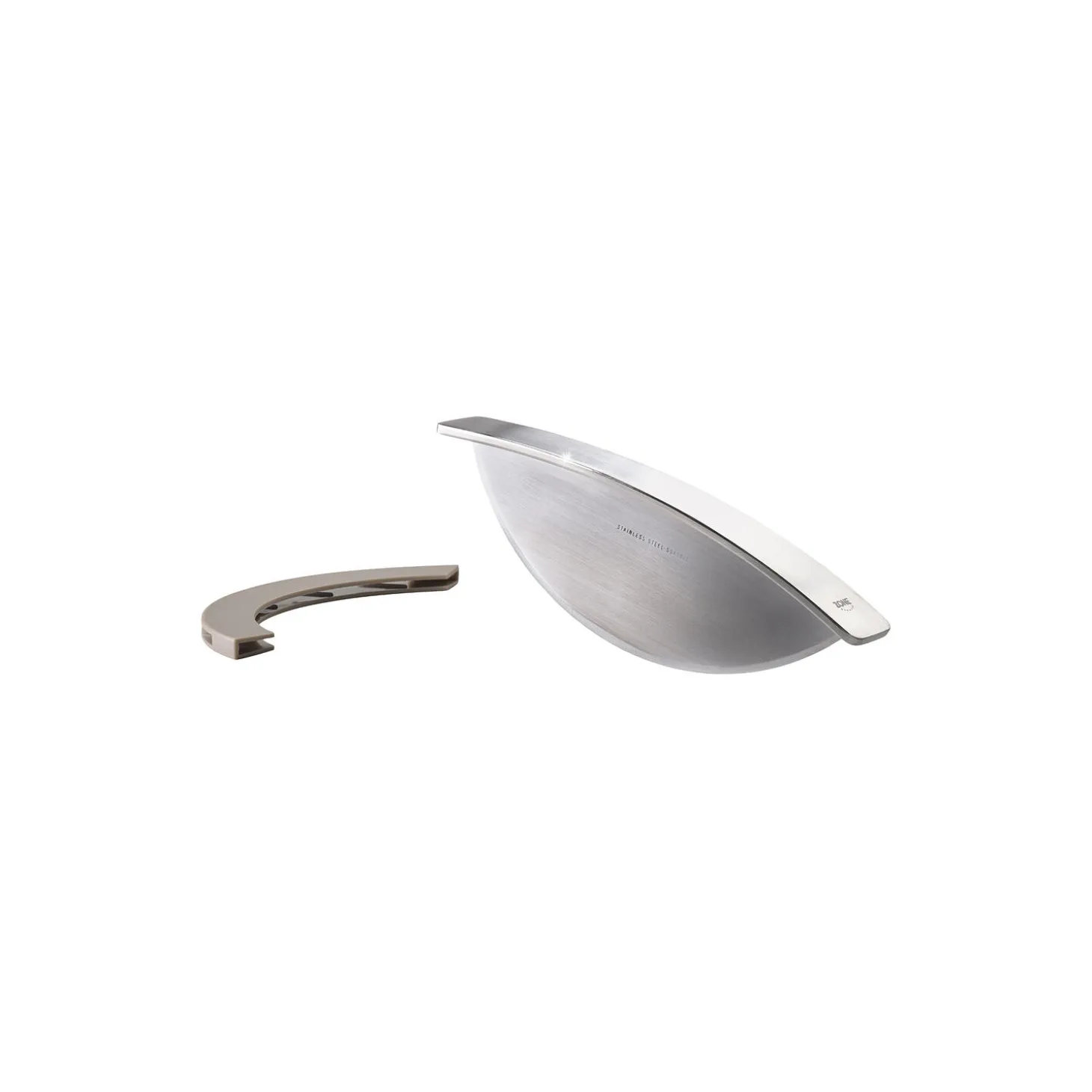 Uundværligt køkkenværktøj i praktisk format. Takket være knivens halvmåneform kan du snitte urter, nødder m.v. i en behagelig vuggende bevægelse. Kniven fylder ikke meget i skuffen, og dens skarpe stålklinge er godt beskyttet af den medfølgende plastskinne. Vask den op i hånden, så holder den sig knivskarp længe. Tip: Prøv den også, når du skærer pizza!