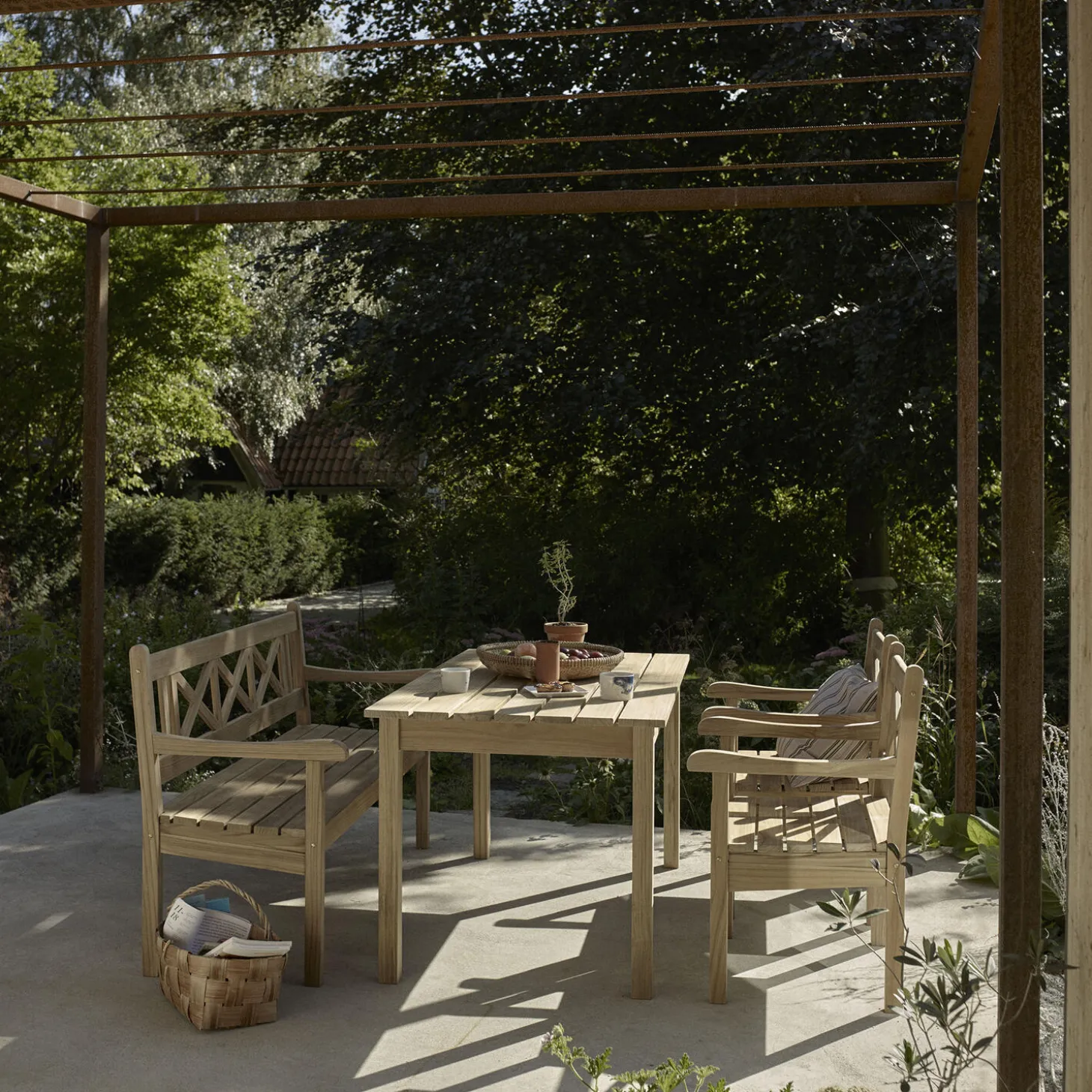 Skagen serien er designet af Mogens Holmriis og inspireret af den naturlige skønhed i området omkring Skagen. Serien, der er kendetegnet ved omhyggeligt håndværk og elegante silhuetter, er fremstillet i teak – en slidstærk og hård træsort, der får en smuk, sølvgrå tone, når den patinerer. Skagen hynden er betrukket med vind-, vand- og smudsafvisende Oeko-Tex®-certificeret stof i en række tidløse farver. Den åndbare hynde er fyldt med hurtigtørrende udendørsskum og har en suveræn siddekomfort. Hynden kan fastgøres til stolen ved hjælp af to snore. Sættet består af 2 x Skagen Chairs, 1 x Skagen Bench og 1 x Skagen Table.