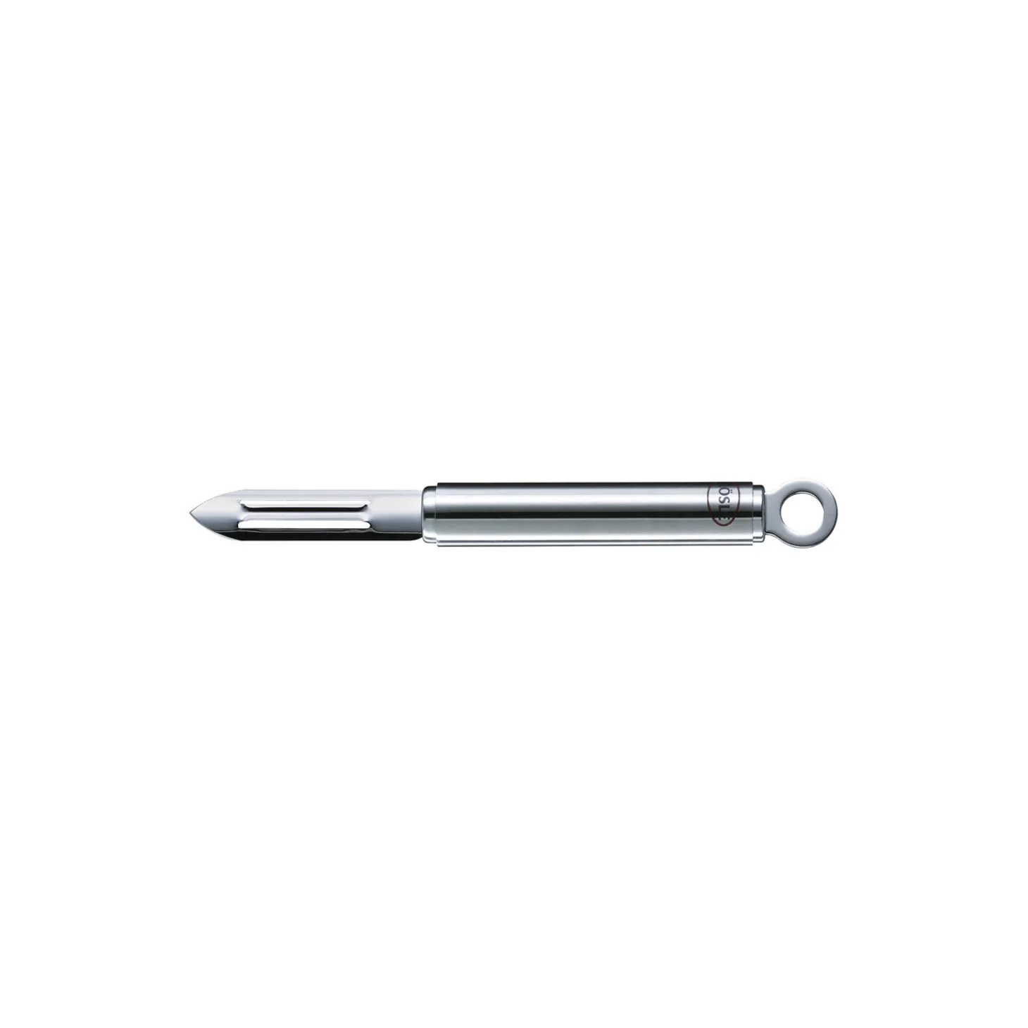RÖSLE skrællekniv til nemt og hurtigt at skrælle tynde lag af grøntsager og frugter. Tåler opvaskemaskine. Mål: L: 19 cm.