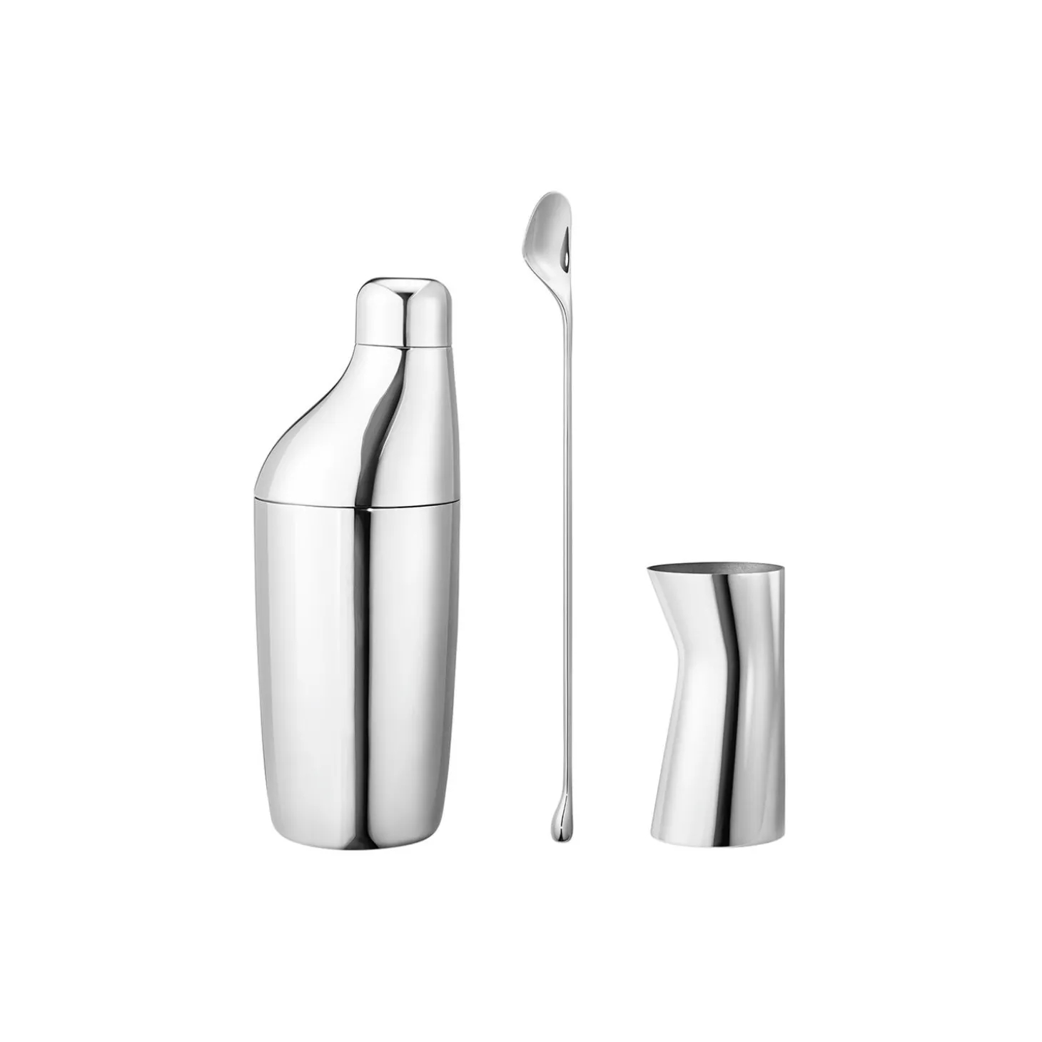 En god cocktail er ikke kun et spørgsmål om sammensætningen af de rigtige ingredienser. Det omhyggelige arbejde med at mixe og shake den er også en væsentlig del af oplevelsen. Og hvorfor ikke give dig selv den bedst mulige start med det smukkest tænkelige barværktøj? Den uhyre moderne cocktailkollektion SKY indeholder en shaker, en røreske og et målebæger, som alle er udført i organiske former. Shakersættet er designet til at få lige så meget ros, som dine drinks. Aurélien Barbry, der har designet SKY, elsker at skabe ergonomisk design, som kombinerer funktion med æstetik. Hans elegante skulpturelle udtryk giver ham en naturlig position i Georg Jensens hæderkronede tradition for organisk formede produkter. Cocktailsættet er udført i rustfrit stål, som efterfølgende er poleret, så finishen er skinnende og det samlede udtryk er lige så minimalistisk, som det er elegant.