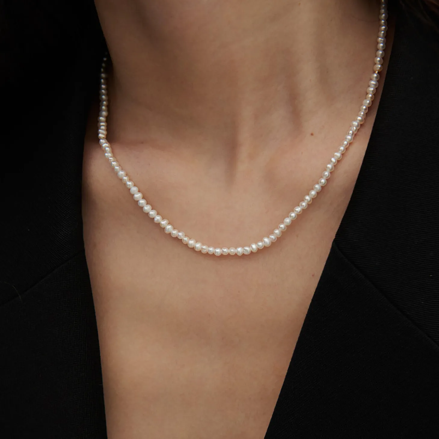 Mød Sky halskæden. Håndlavet på vores eget værksted i Danmark. En af vores håndlavede klassikere, der passer perfekt til din personlige kollektion. Simple, gyldne glasperler er sat sammen med vores runde ferskvandsperler, der hver har diskrete forskelle i form og farve.