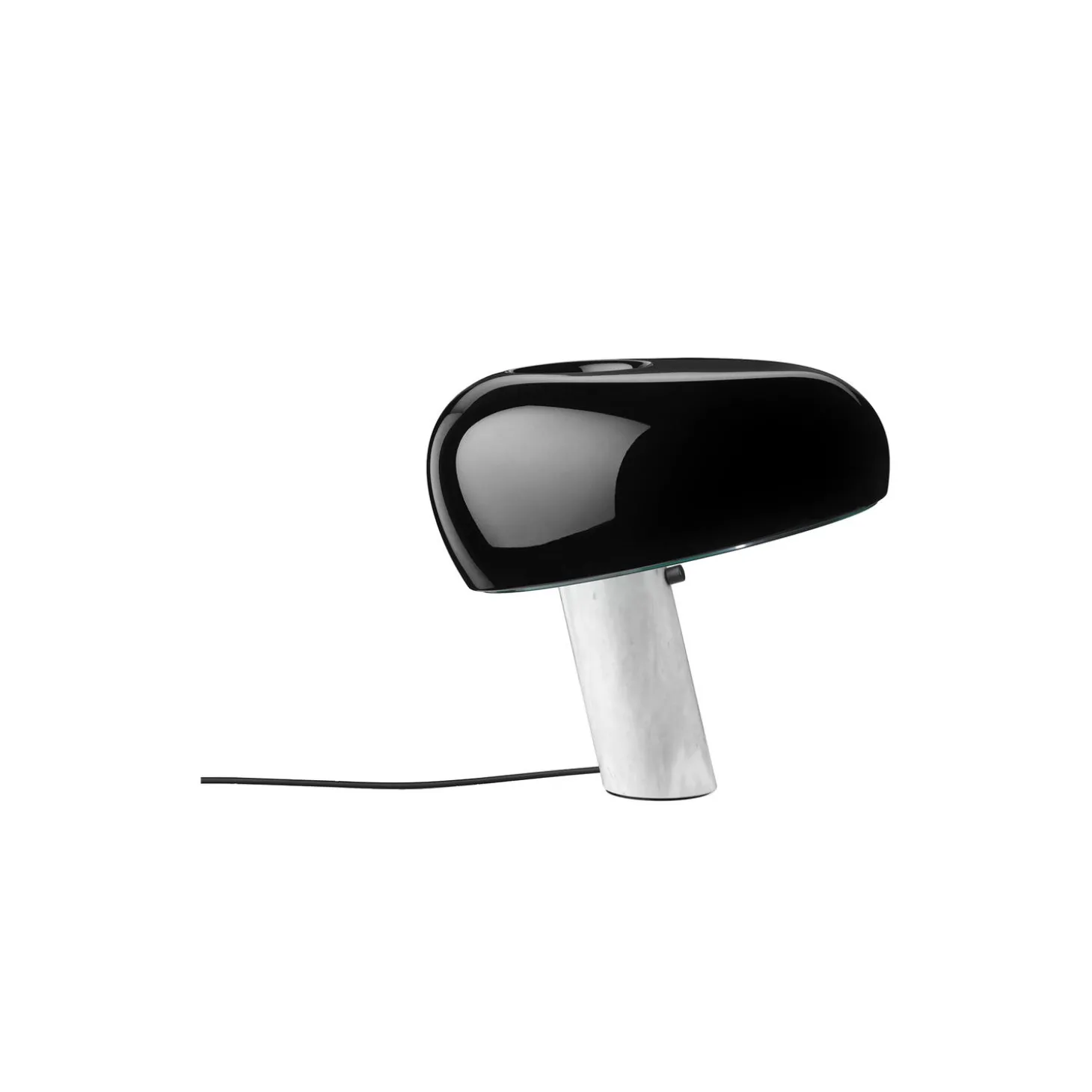 Snoopy bordlampe med skærm i emaljebelagt metal og klart glas med base i poleret marmor fra FLOS. Farve: black. Mål: H: 36,9 x B: 39,4 cm. Lyskilde: 100W E27 med integreret dimmer. Design: Achille & Pier Giacomo Castiglioni.
