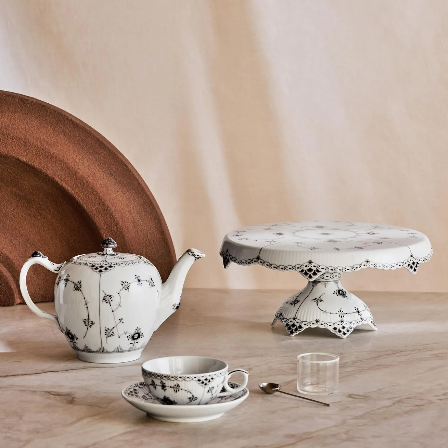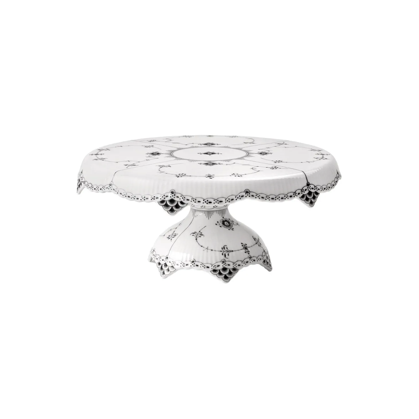 Den Sort Musselmalet Halvblonde fad på fod er et smukt bud på en gammel klassiker fra Royal Copenhagens arkiv. De udsmykkede blondedetaljer, der falder elegant ned fra kanten og bunden, minder om en klassisk dug med blondekant. Dette fad på fod er sikker på at hæve enhver sød portion placeret på den riflede overflade.