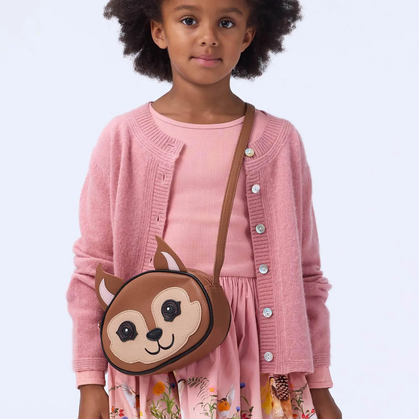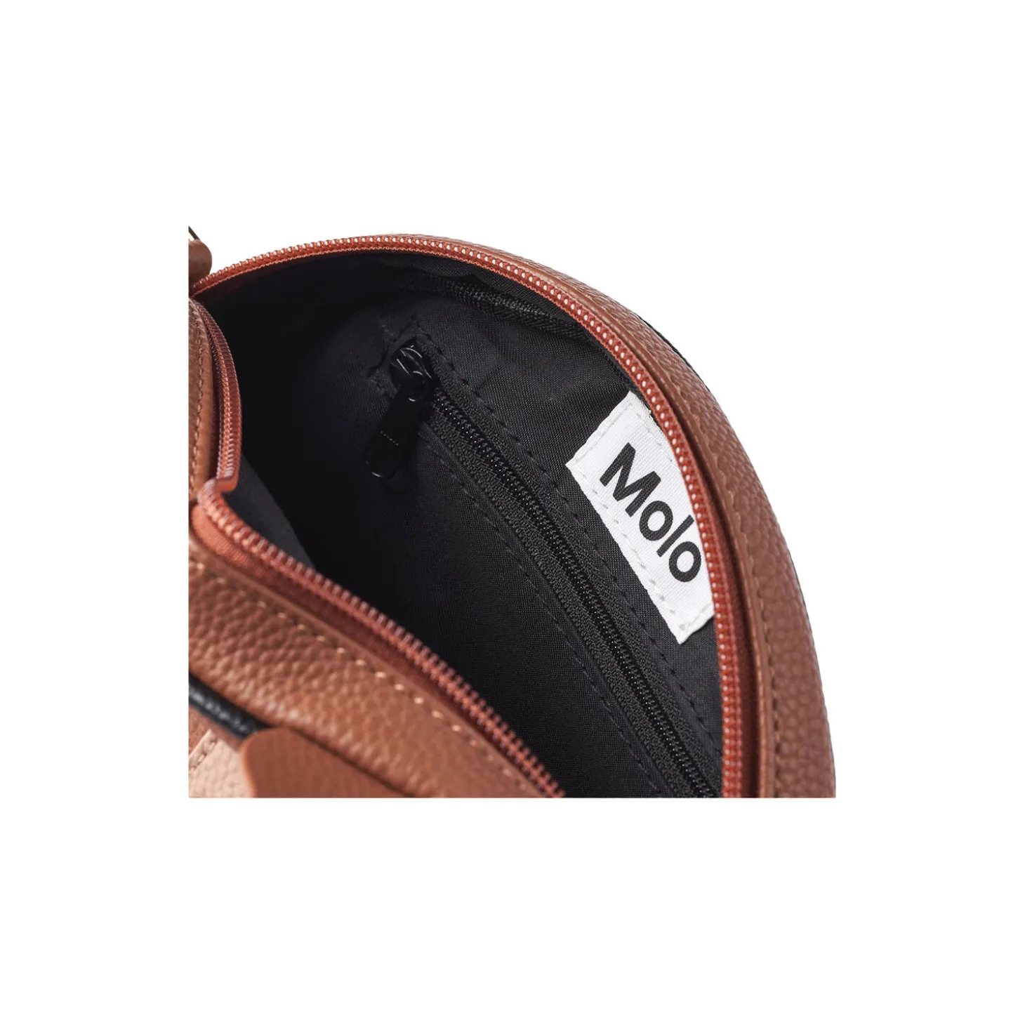 Brun taske med justerbar strop og et lille indvendigt rum med lynlås. Tasken måler 19 cm i bredden, 14 cm i højden og 5,5 cm i dybden.