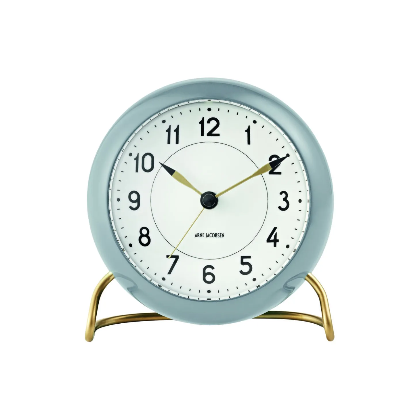 Det elegante Station bordur fra Arne Jacobsen Clocks er oprindeligt tegnet helt tilbage i 1939, hvor Arne Jacobsen designede bolig til direktøren for el-virksomheden Lauritz Knudsen. Det flotte ur i grå/hvid med mat messingfod måler 11 cm og har både snooze-funktion og lyssensor, der gør uret ideelt til brug som vækkeur i soveværelset. Designet er stilfuldt med rene linjer og et enkelt udtryk, der passer perfekt ind i alle moderne hjem.