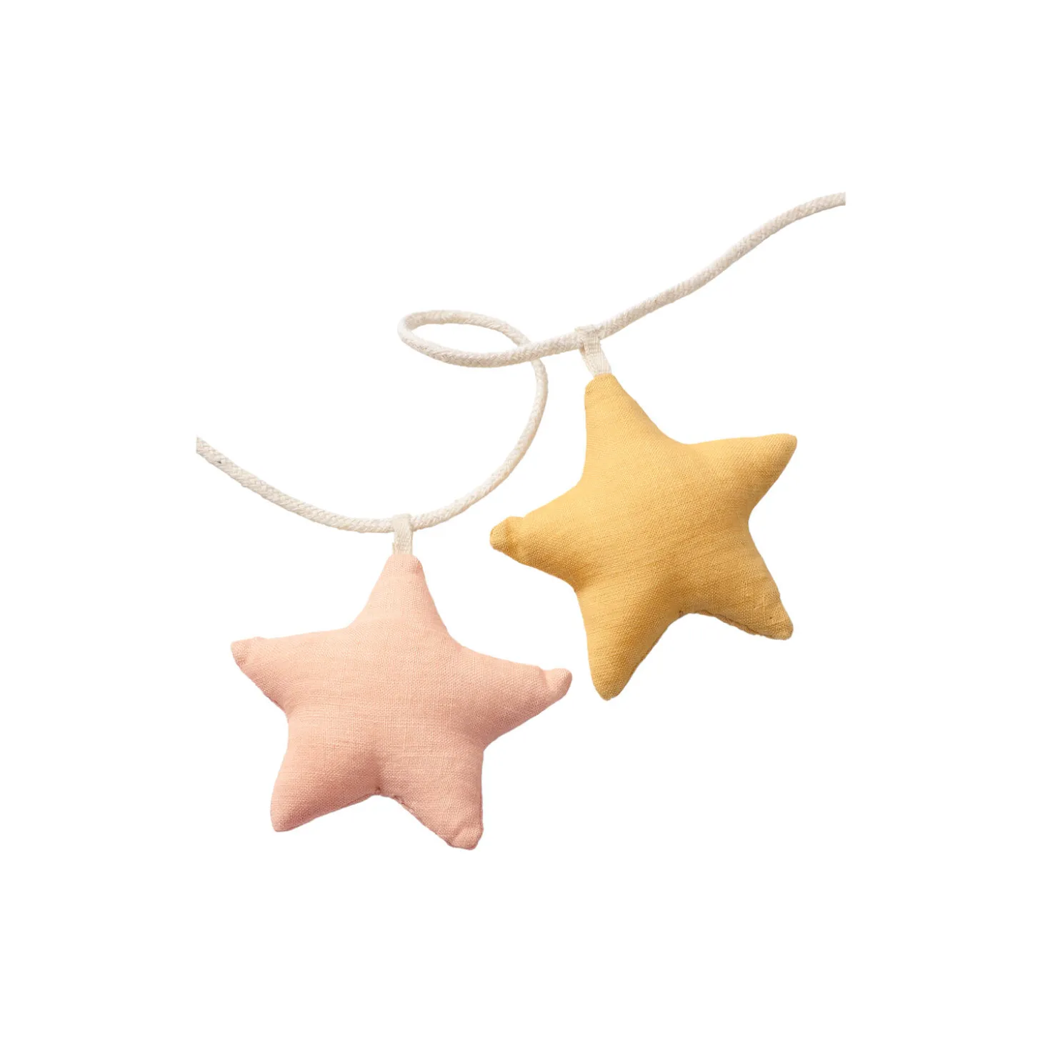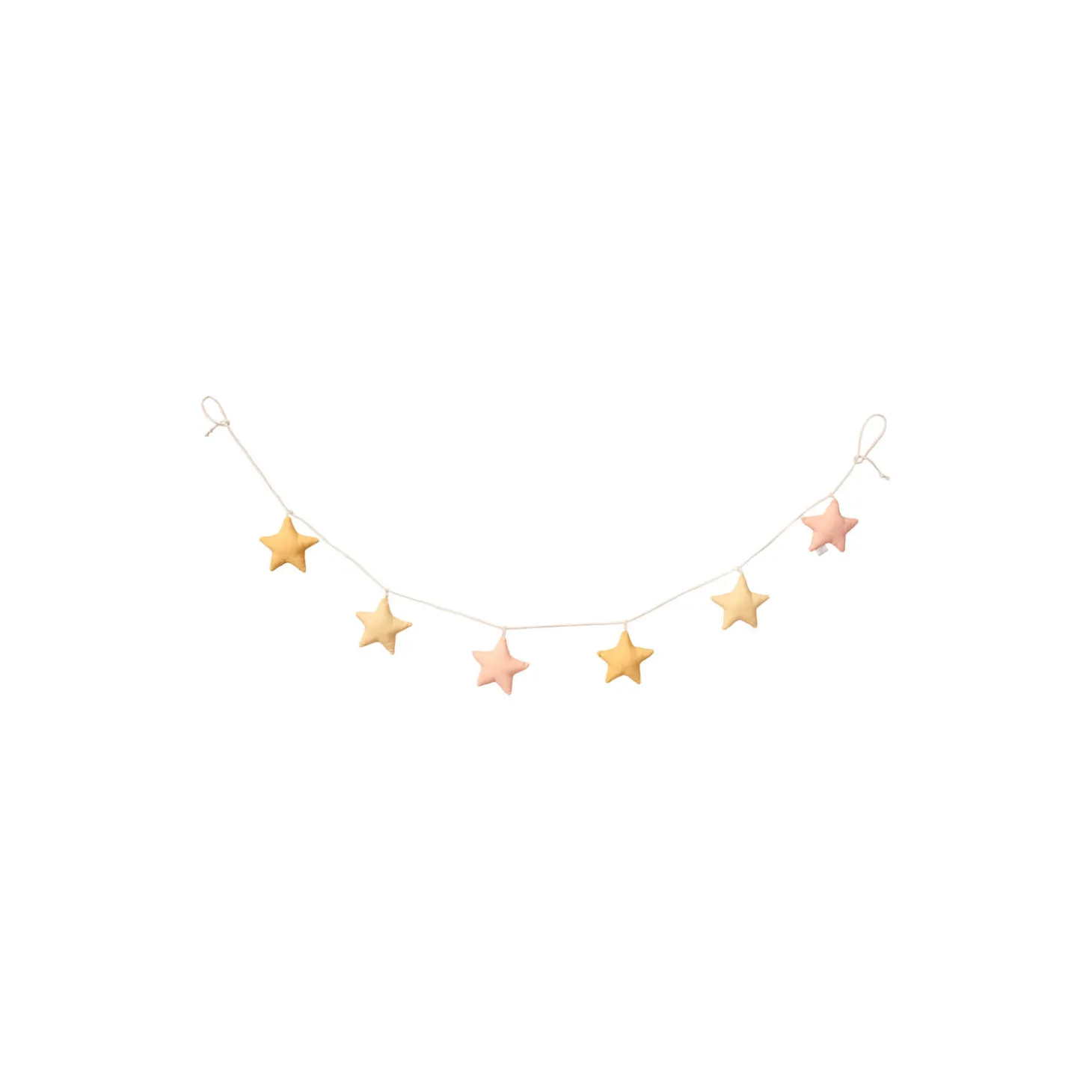 En guirlande er en skøn tilføjelse til børneværelset. På en himmelseng eller en babyseng, som vægdekoration eller i et vindue. Denne guirlande har 6 stjerner i 3 nuancer af gul og sart rosa på en bomuldssnor.