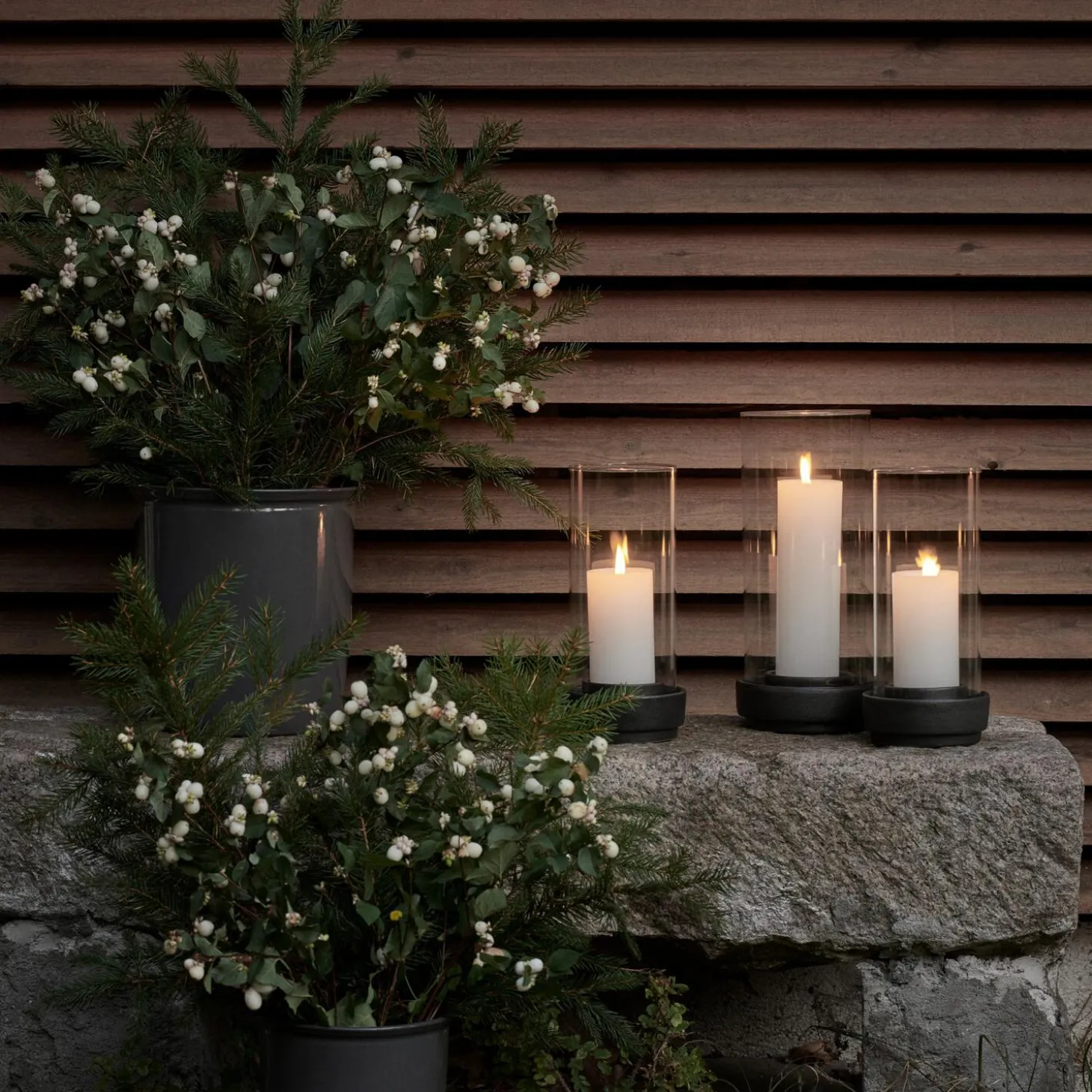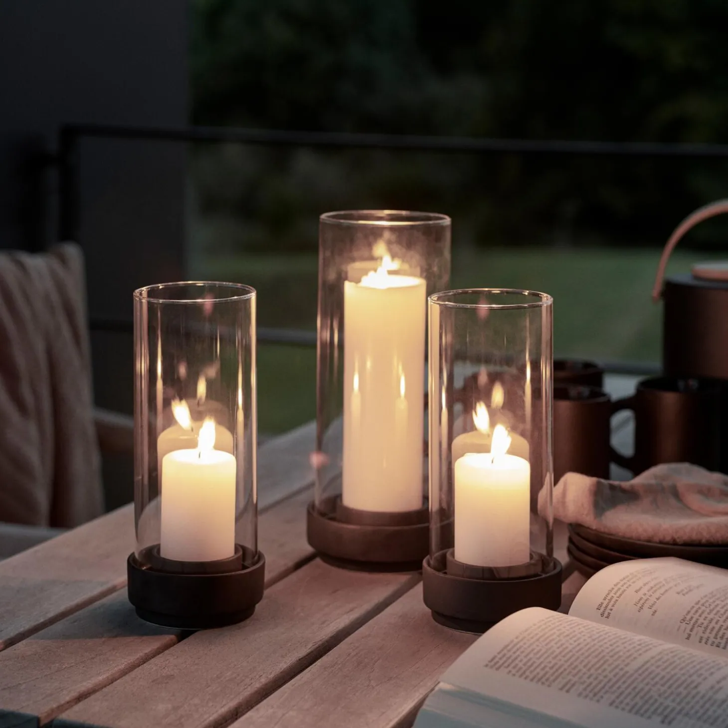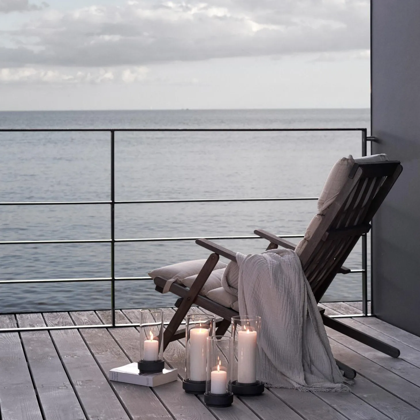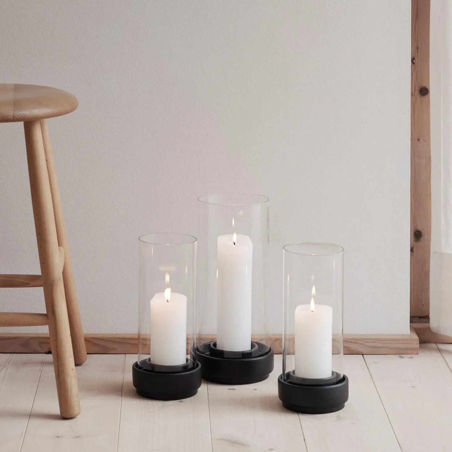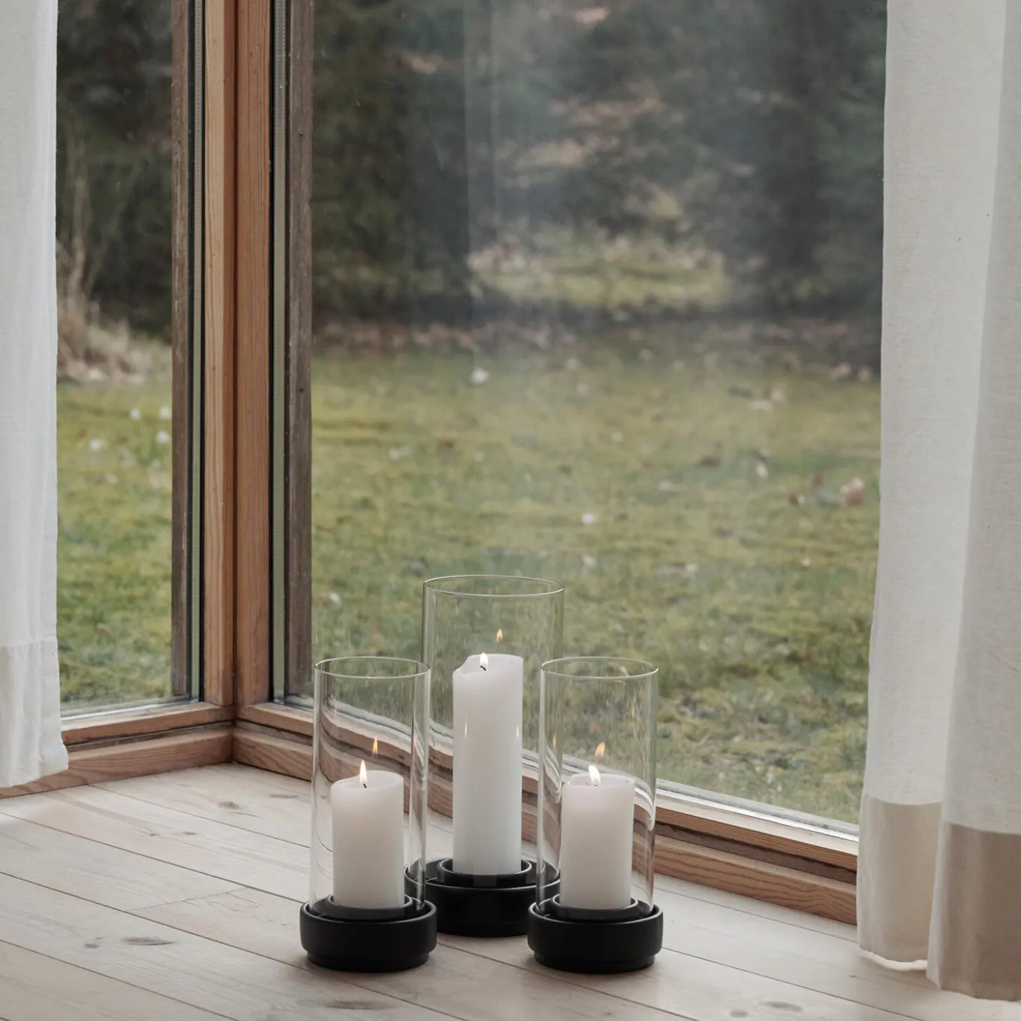 Med sin velkendte sans for enkelhed har Maria Berntsen designet disse stilrene hurricanes, der kan bruges året rundt som lyskilde i hjemmet, både udendørs og indendørs. Skulle hurricanen blive efterladt udendørs i regnvejr, sørger det smarte design for, at regnvandet løber ud af sig selv. Det sorte stentøj er vejrbestandigt og kan tåle at blive efterladt udendørs, også i frostvejr. Brug LED-lys, stearinlys eller paraffinlys som fyrfadslys eller bloklys. Lyset kan være diameter maks. Ø: 7 cm til den store Hurricane og maks. Ø: 6 cm til den lille.