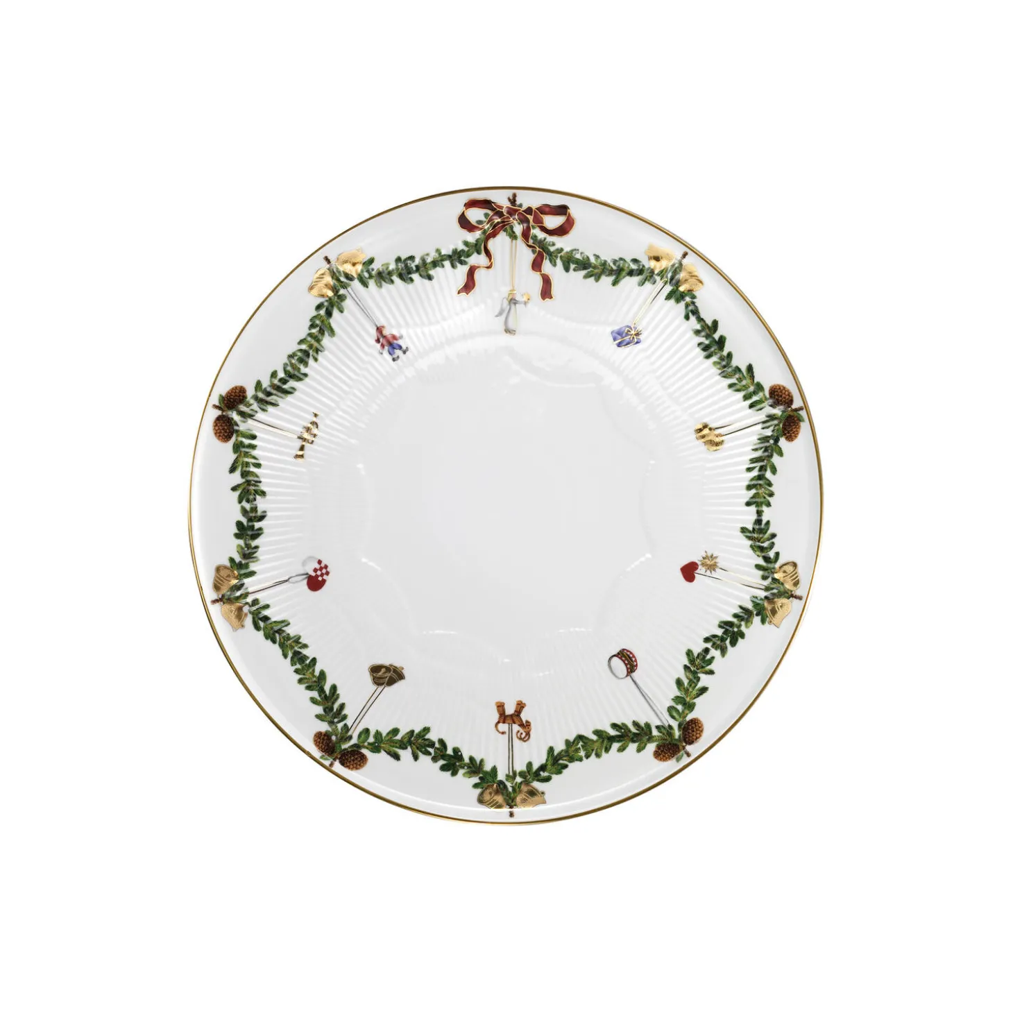 Stjerne Riflet fad i porcelæn fra Royal Copenhagen. Skab en særlig plads på julebordet til dette fad i Stjerne Riflet Jul. Fadets kant er udsmykket med en granguirlande pyntet med grankogler og juleornamenter. Fadet på 32 cm står lavt på bordet og er ideelt til julens kager og konfekt. Fadets dekoration af en stjerne i relief er en særlig, diskret detalje.