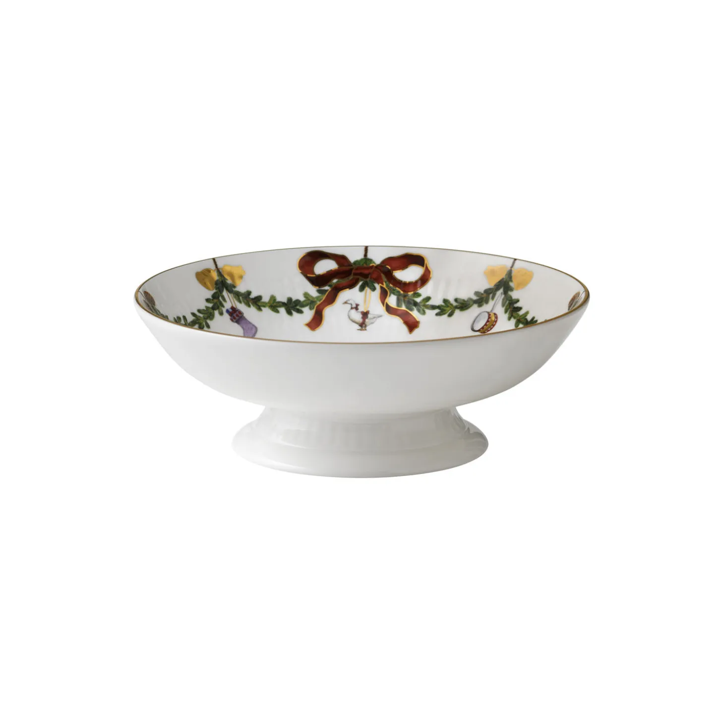 Stjerne Riflet Jul skål på fod i benporcelæn fra Royal Copenhagen. Lav de fineste serveringer af dine julekager og klementiner med denne skål på fod fra det elskelige julestel, Stjerne Riflet Jul. Skålen på 18 cm er dekoreret med en granguirlande, der er pyntet med julepynt og sløjfer med gulddetaljer, der fortsætter videre på skålens kant.