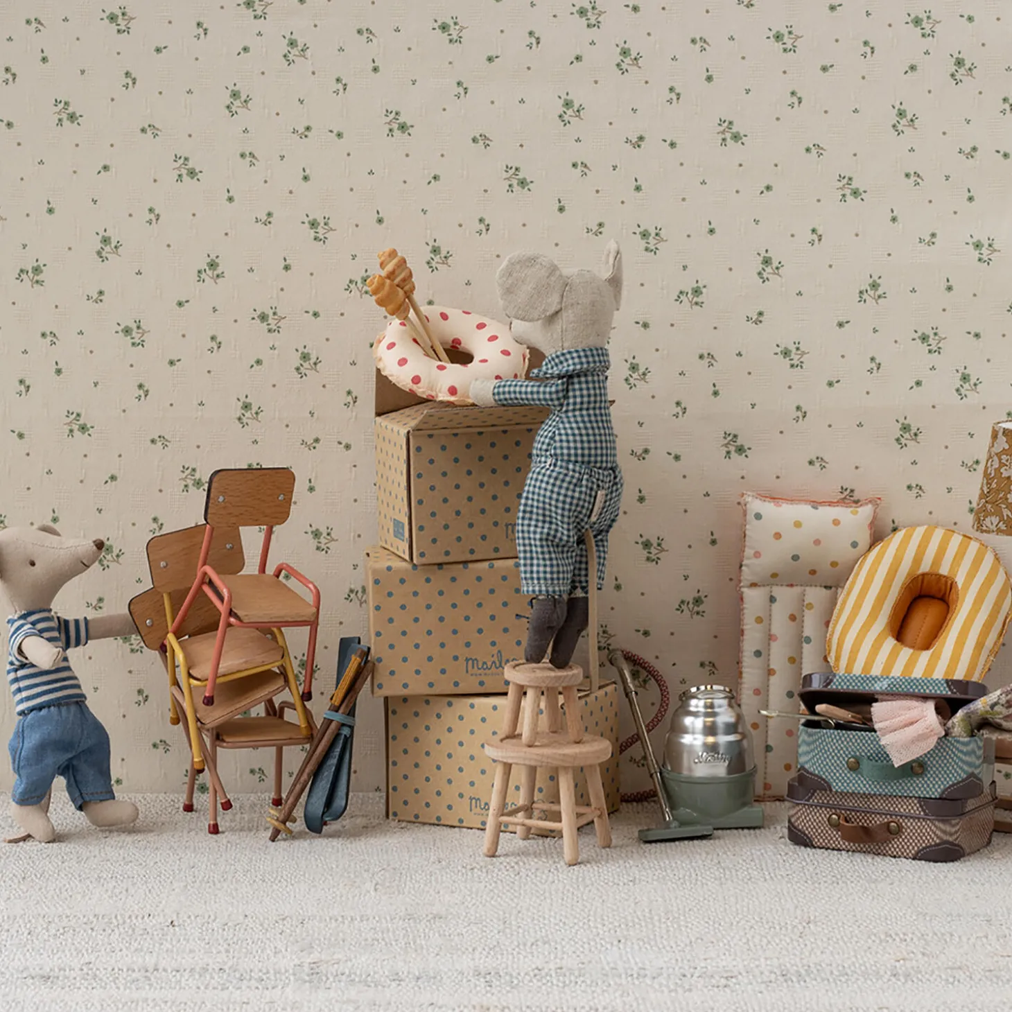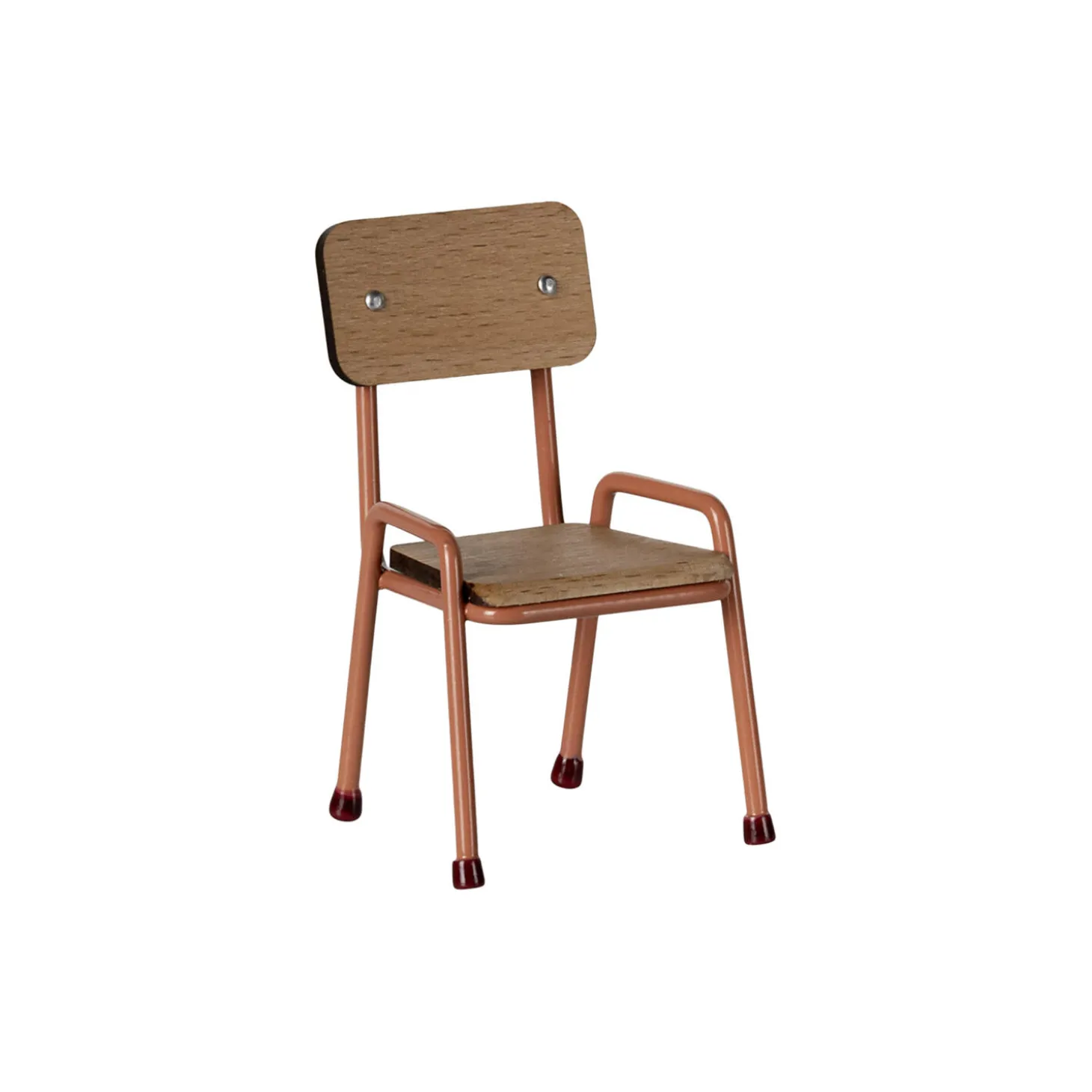 En stol der passer til musefamilien og kan bruges i mange situationer. Stolen er i samme model som sættet med bord og stole til mus. Bemærk de håndmalede detaljer på metallet.