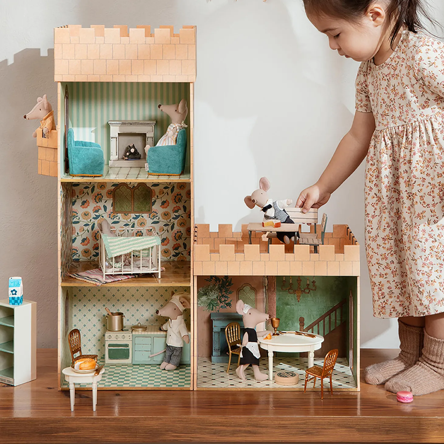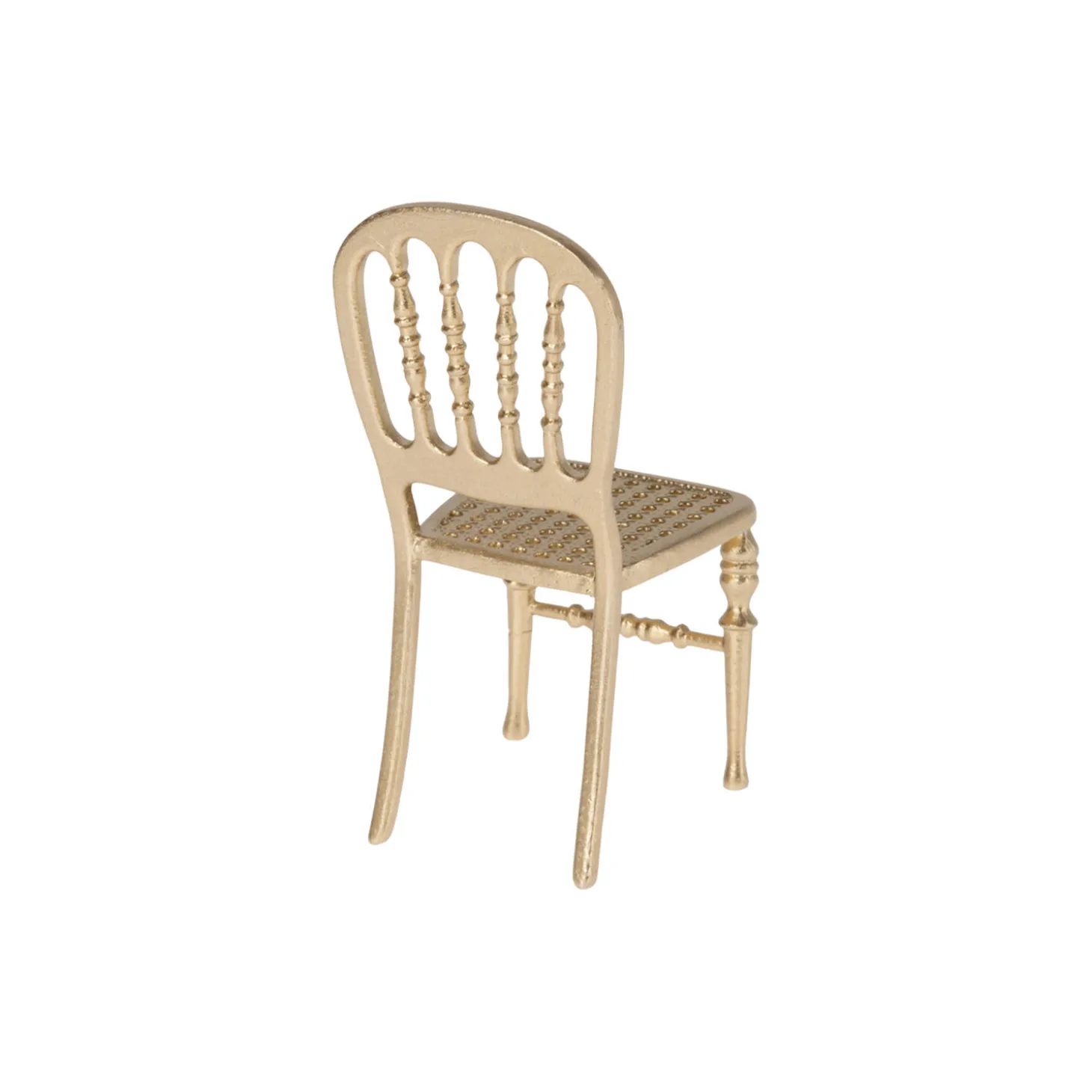 En stol i perfekt størrelse til musefamilien. Den er lavet i metal med et gyldent finish og har de smukkeste detaljer. Denne stol passer sammen med alle borde i musestørrelse.