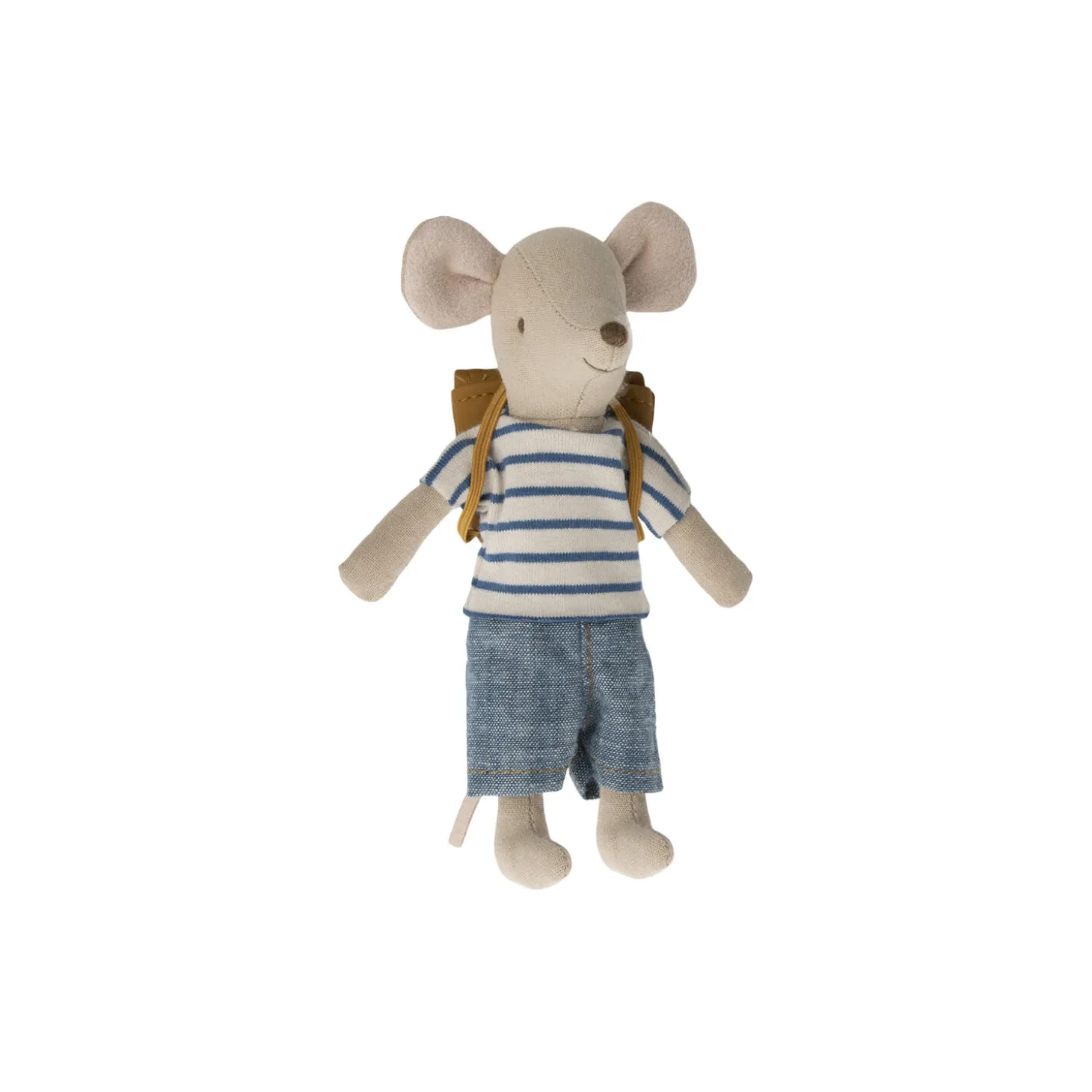Storebror mus er klar til en dag i børnehave eller skole, på ryggen bærer han sin rygsæk. Han har magneter i hænderne, så han kan holde fast i håndtagene på den trehjulet cykel.