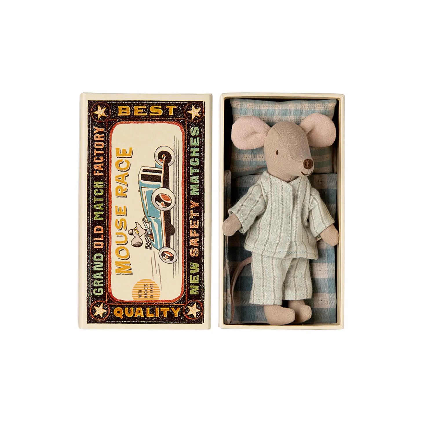 Et klassisk Maileg produkt. Denne mus er klar til timevis af leg og sover godt i den lille tændstikæske. Tøjet og sengetøjet kommer i unikke print og smukke farver. Udvid legen ved at tilføje mere tilbehør.