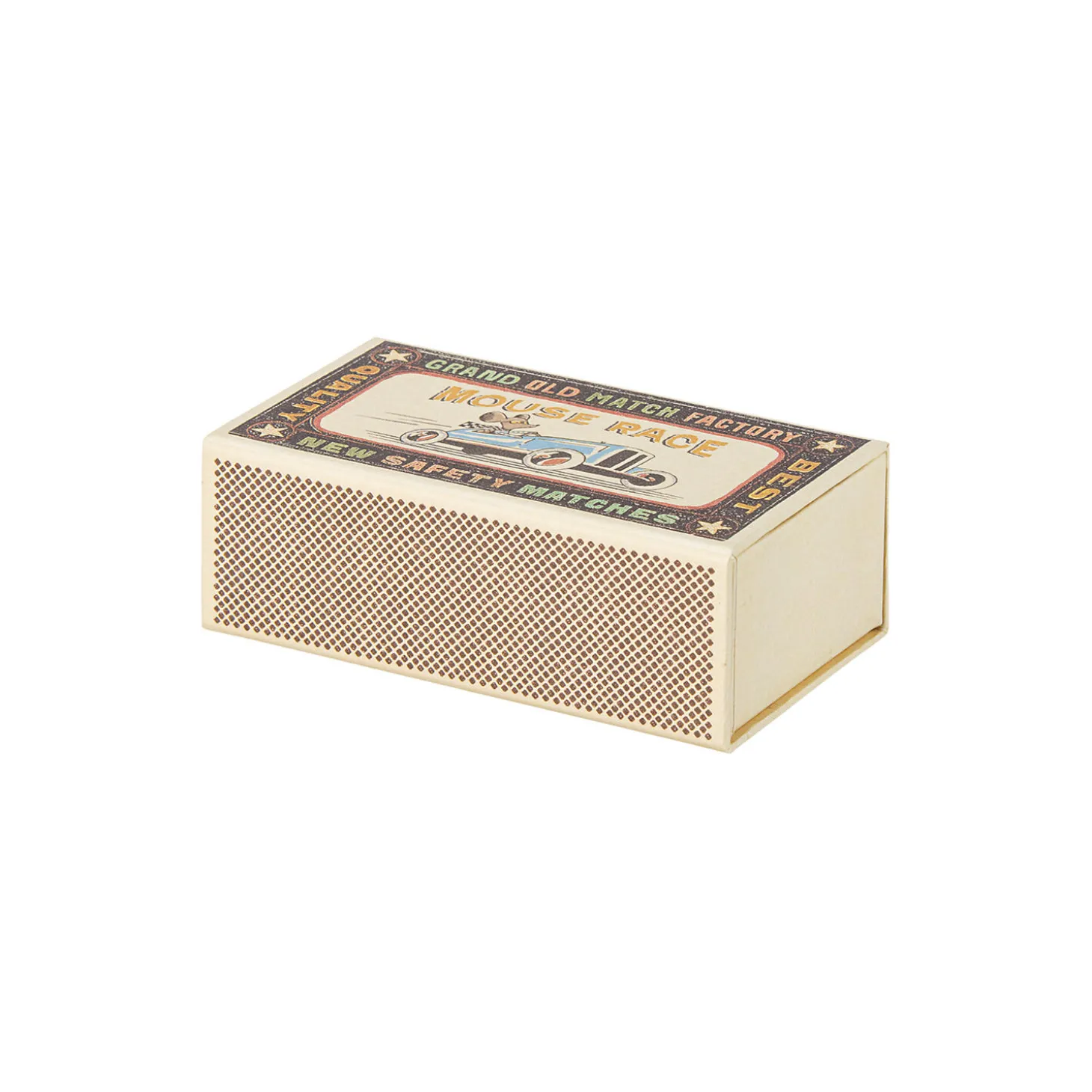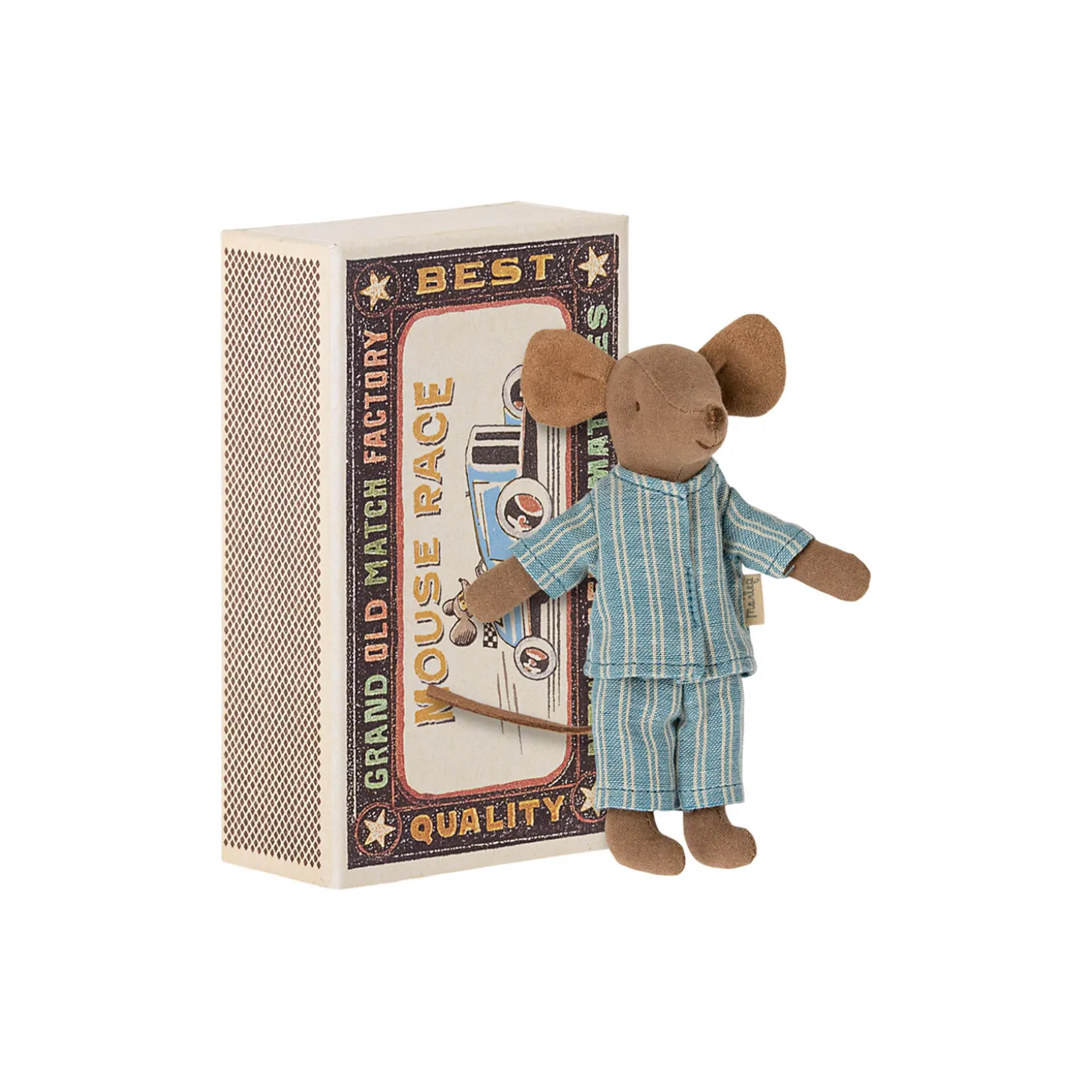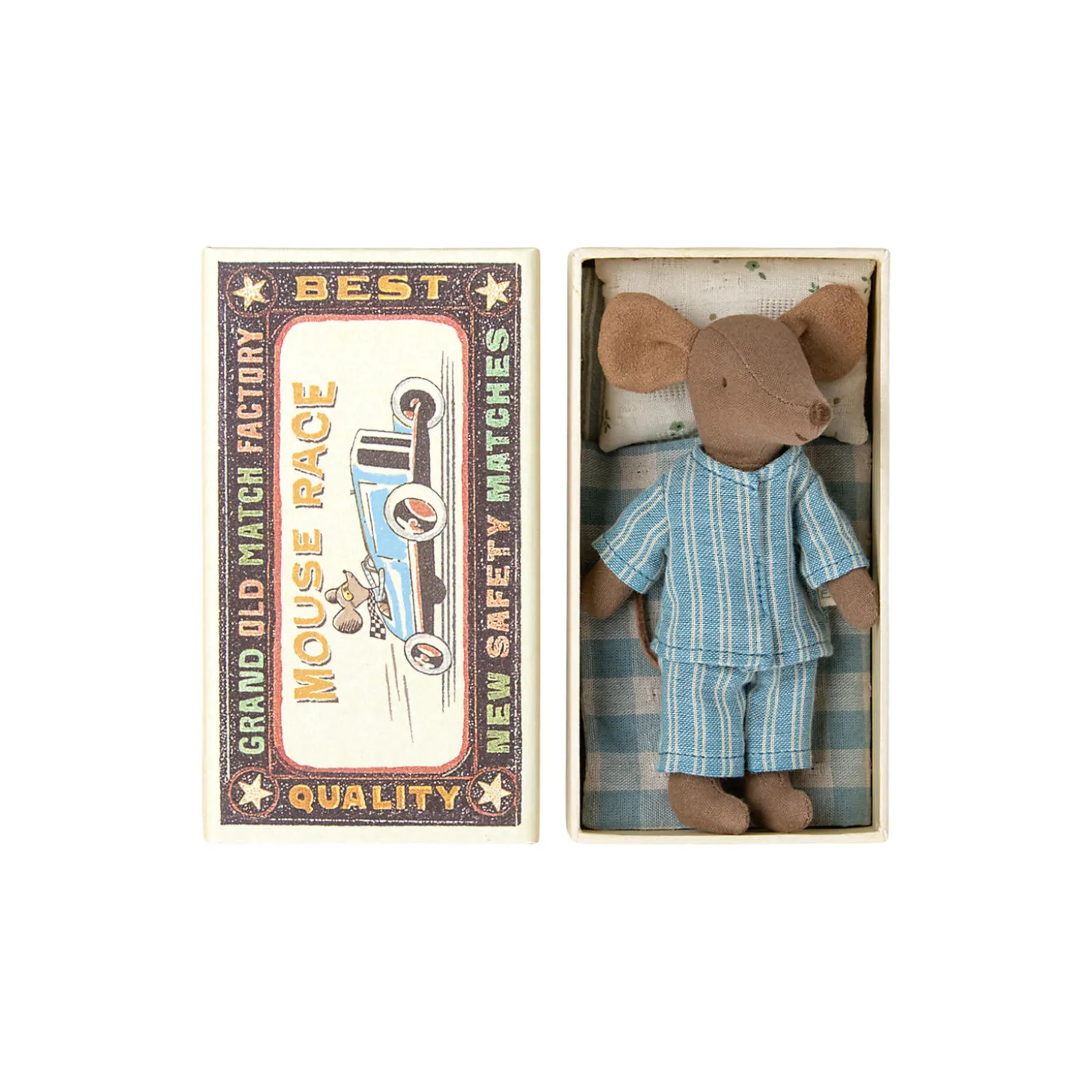 En klassisk Maileg-vare. Denne mus er klar til timevis af leg og sover godt i tændstikæsken. Tøjet og sengetøjet kommer i unikke mønstre og smukke farver.