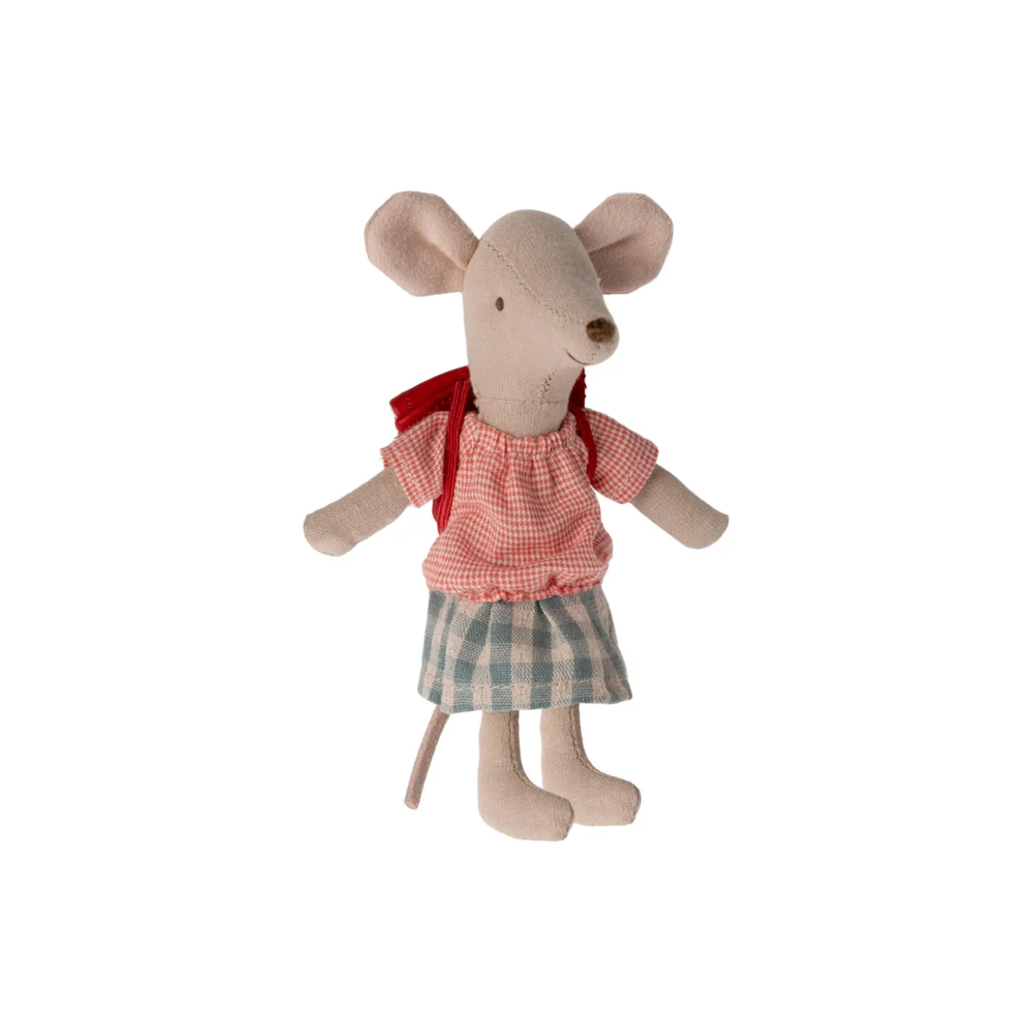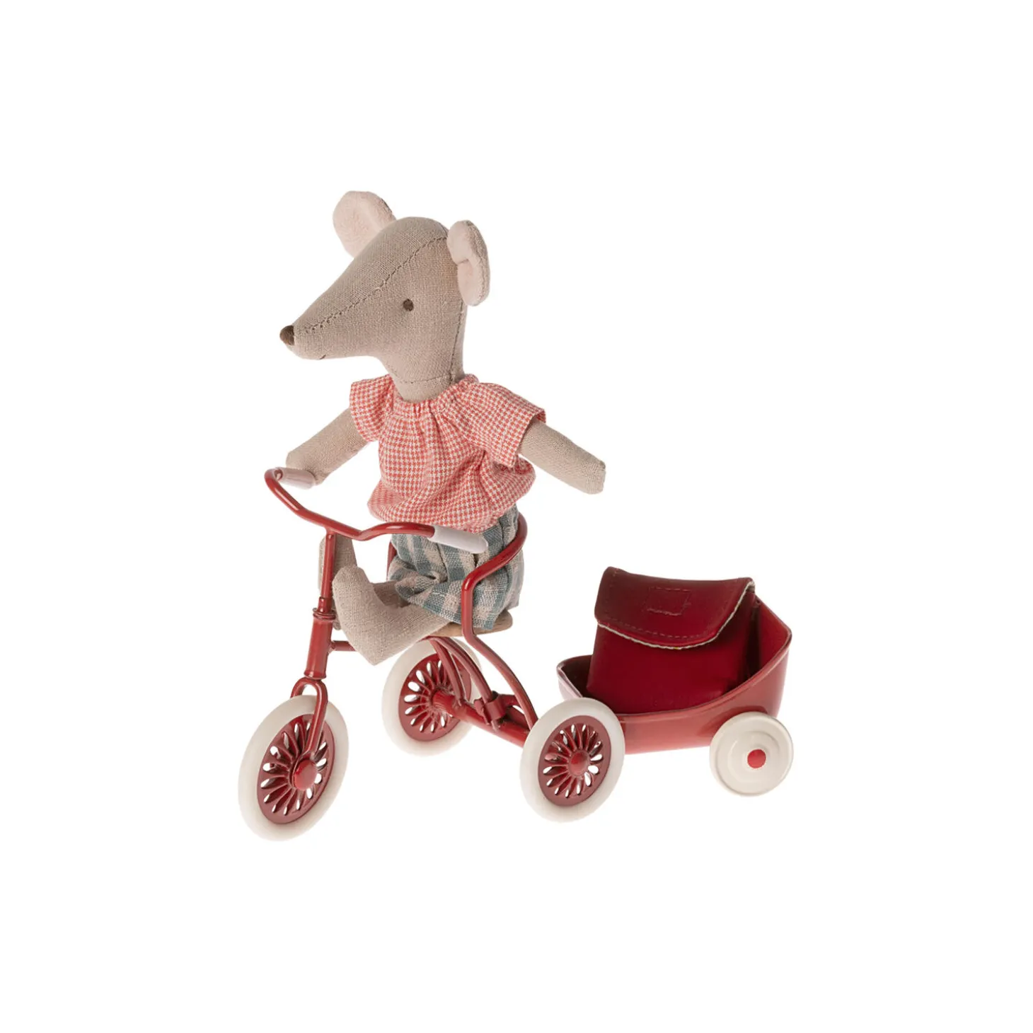 Storesøster mus er klar til en dag i børnehave eller skole, på ryggen bærer hun sin rygsæk. Hun har magneter i hænderne, så hun kan holde fast i håndtagene på den trehjulet cykel.