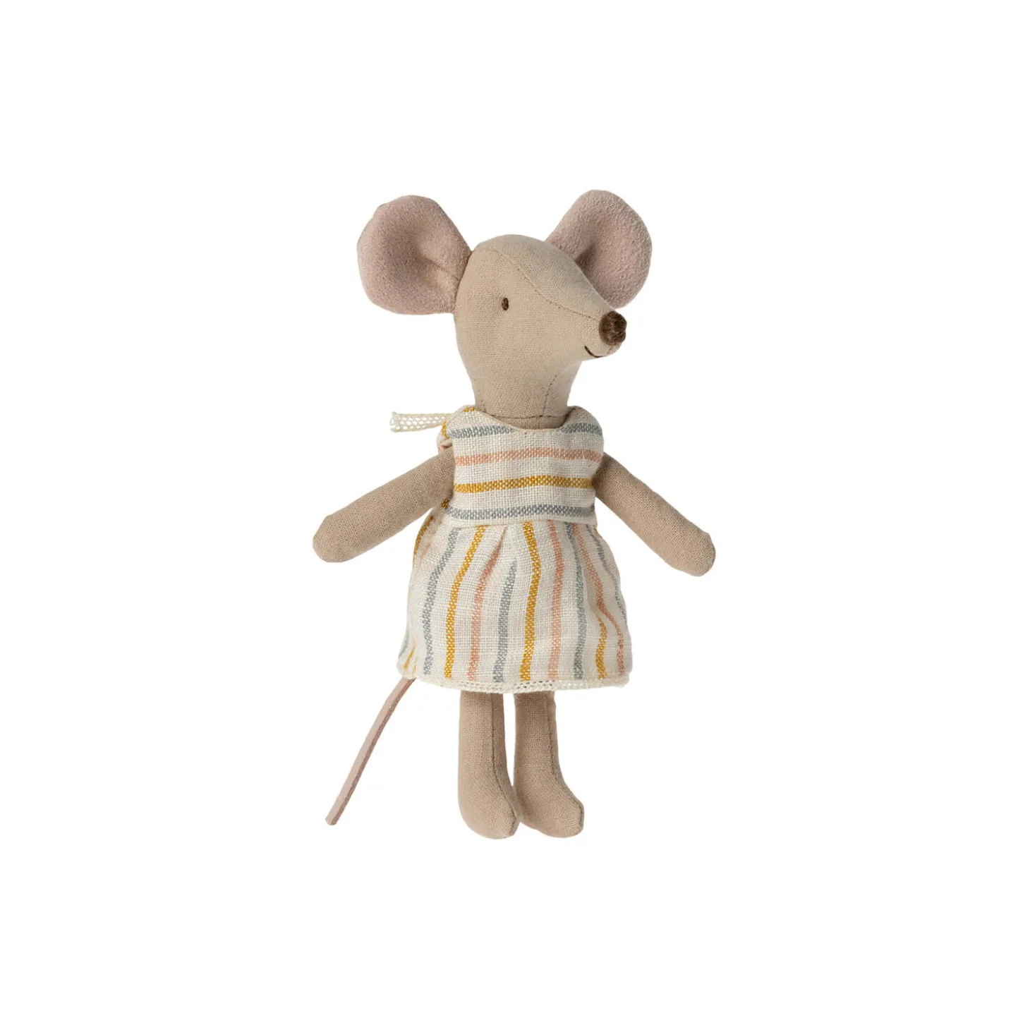 En klassisk Maileg vare. Denne mus er klar til timevis af leg og sover godt i en lille tændstikæske. Tøj og sengetøj er lavet af bløde stoffer med unikke mønstre og smukke farver.