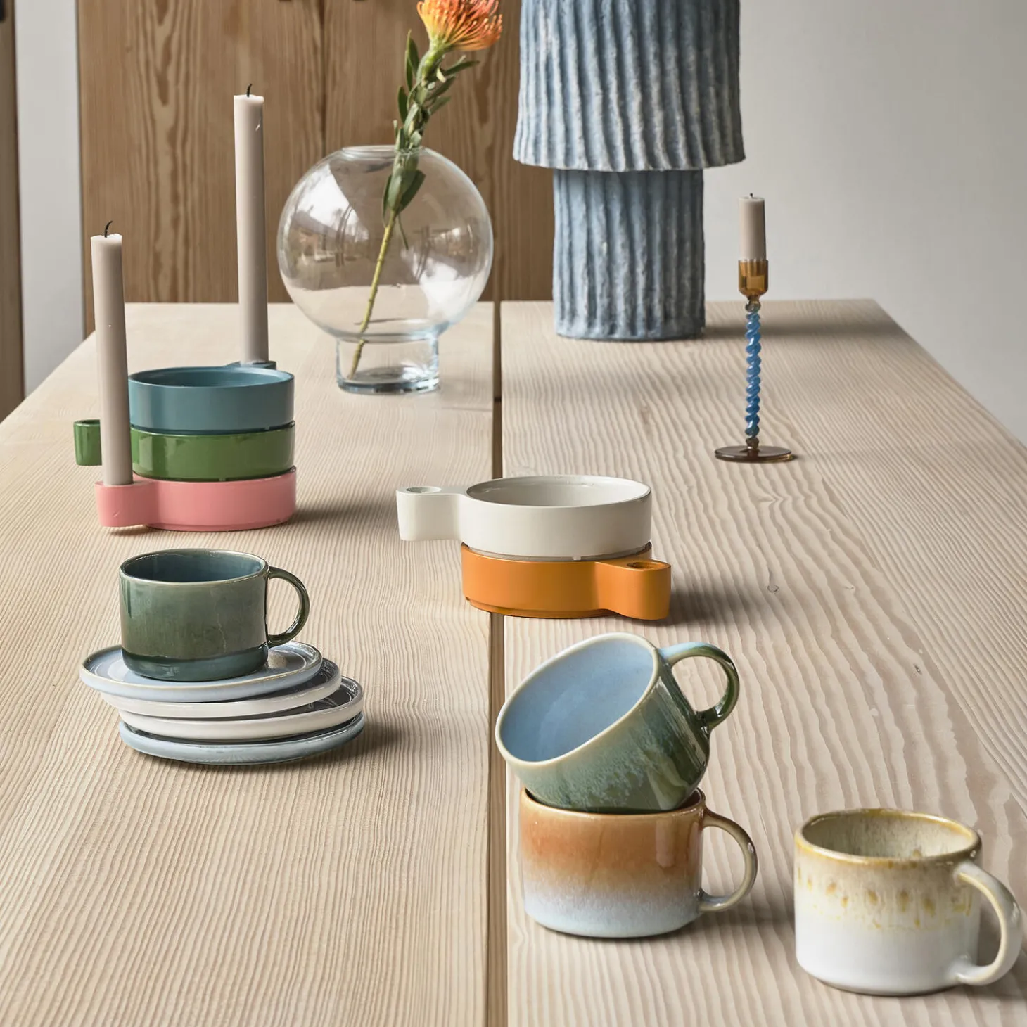 2 krus, 16 cl, i stentøj. Stentøjsstellet fra Villa Styles fremstilles i Portugal af keramikere med stor knowhow og erfaring. Alle steldelene formes og finpudses i hånden, hvilket giver et skønt og unikt stentøjsstel samt en glat og fin overflade. Herefter påføres den reaktive glasur, og stentøjet brændes i ovnen ved 1150 grader. Den reaktive glasur gør hvert produkt unikt. Udseendet afhænger af formen, brændetemperaturen og placeringen i ovnen. Alle glasurer er skabt fra bunden af vores portugisiske producent. De nøje udvalgte glasurer i livsbekræftende og eksklusive farver tiltaler øjet. Serien kan sættes sammen på kryds og tværs, og derved skabes et personligt stel. Den brede vifte af farver indeholder noget for enhver smag, både den farveglade og den mere afdæmpede. Fabrikken genanvender vandet, der bruges i produktionen, og varmen genereret af keramikovnene bliver ført ind i rummene, hvor keramikken tørres, så al gasenergi genanvendes. Fabrikken laver sit eget ler og genanvender alle rester ved at blande dem med nyt ler og bruge blandingen til nye produkter, så der ikke er noget, der går til spilde.