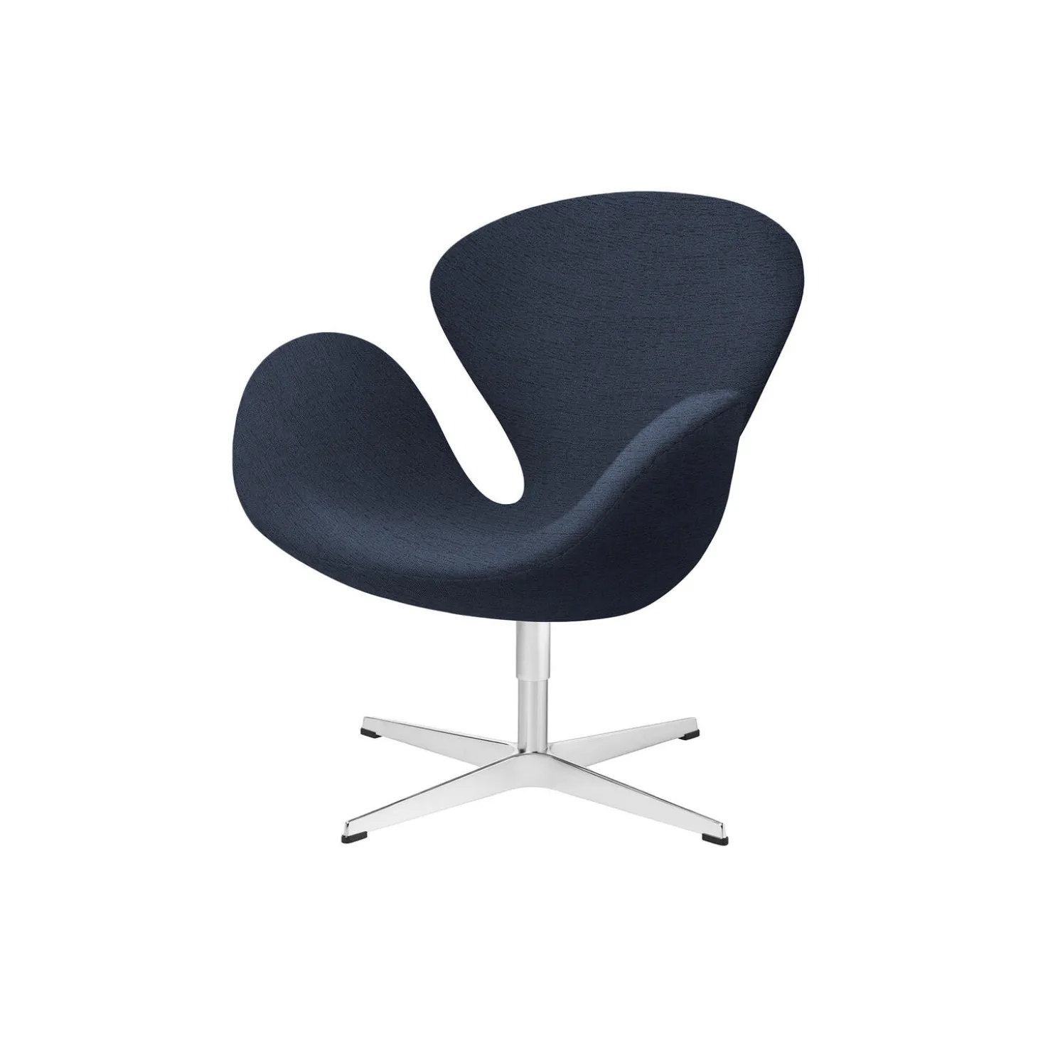 Svanen™ 3320 loungestol med polstring i Christianshavn 1154 og stel i satinpoleret aluminium fra Fritz Hansen. Farve: blå. Mål: H: 77 x B: 74 x D: 68 cm. Siddehøjde: 40 cm. Design: Arne Jacobsen.