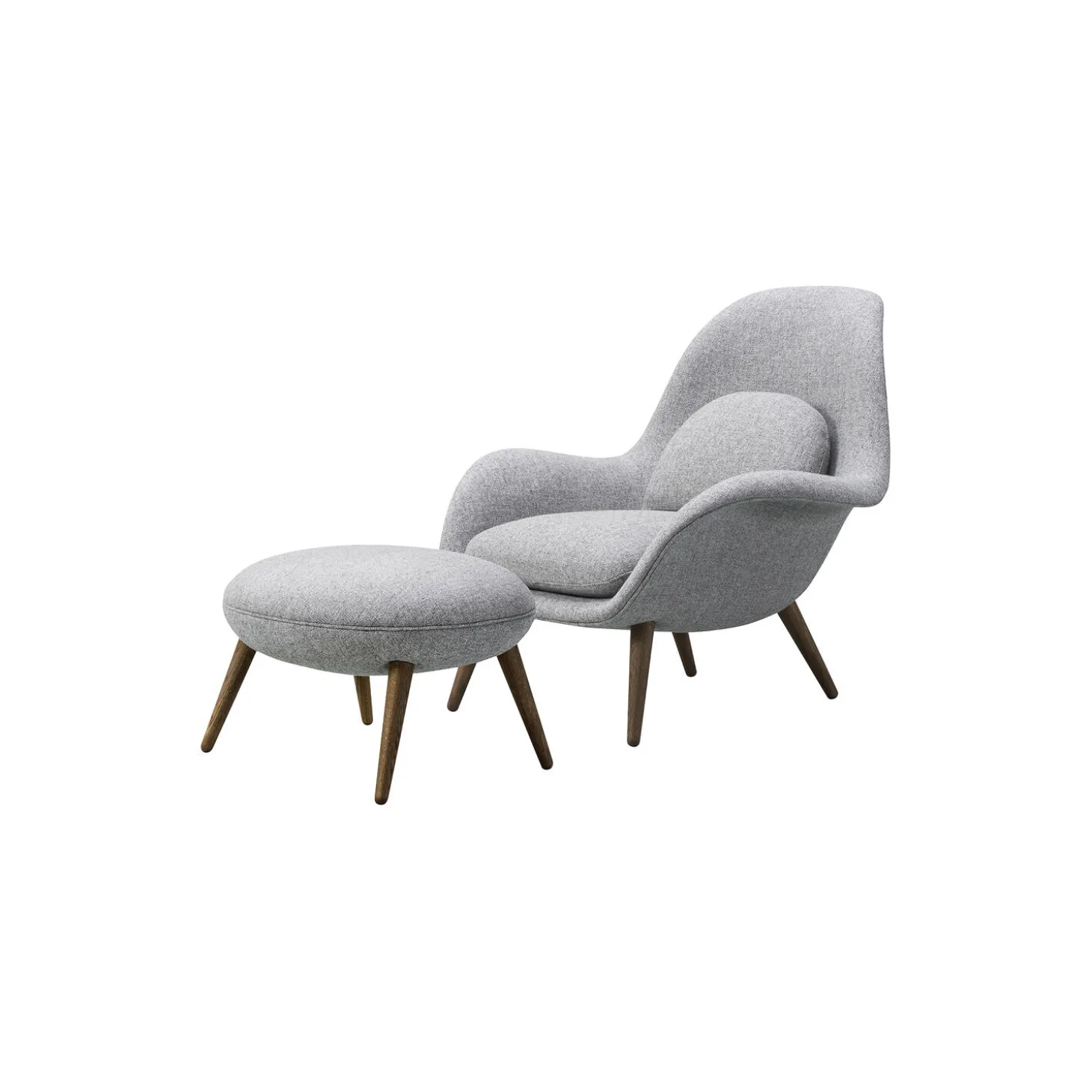 Swoon loungestol og skammel med polstring i Hallingdal 65 130 og stel i røget eg fra Fredericia. Farve: grå/røget eg. Mål: H: 83,5 x B: 90 x D: 88,5 cm / H: 40,5 x B: 63 x D: 52,5 cm. Siddehøjde: 41,5 cm. Design: Space Copenhagen.