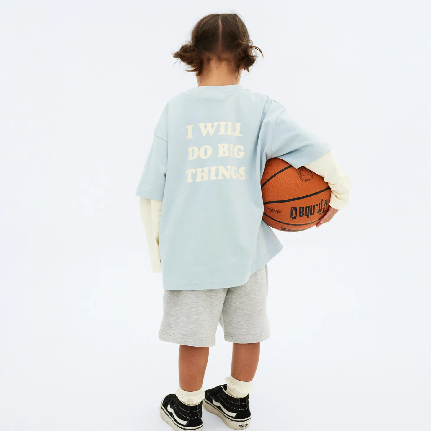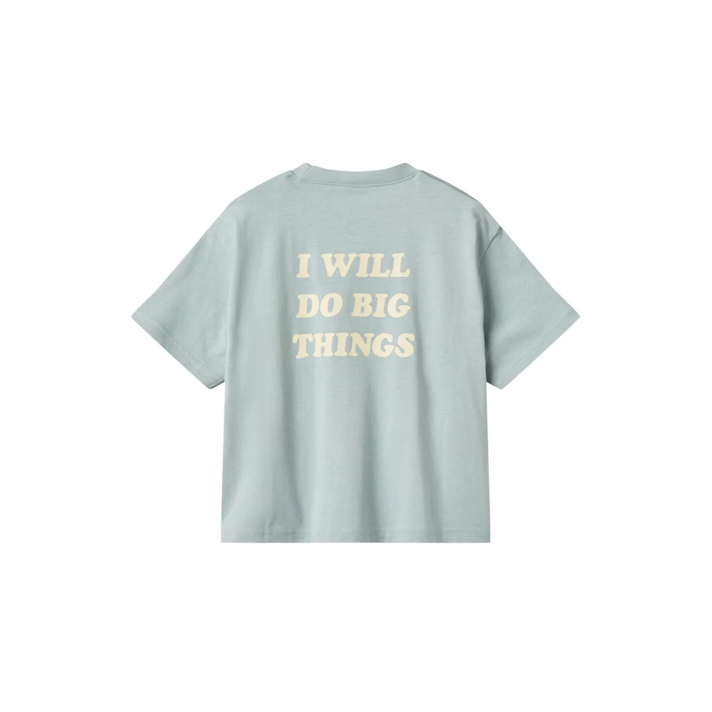 Wheat x Pernille Teisbæk for Børnecancerfonden’ is a limited edition collection of unisex children’s clothing – all profits go to the Danish Childhood Cancer Foundation.—Oversize t-shirt in soft GOTS-certified jersey with a print saying ‘I Will Do Big Things’ on the back.—- Standard 100 by OEKO-TEX®- 100% organic cottonThe product is GOTS certified.Certified by CUC license no. 1198955